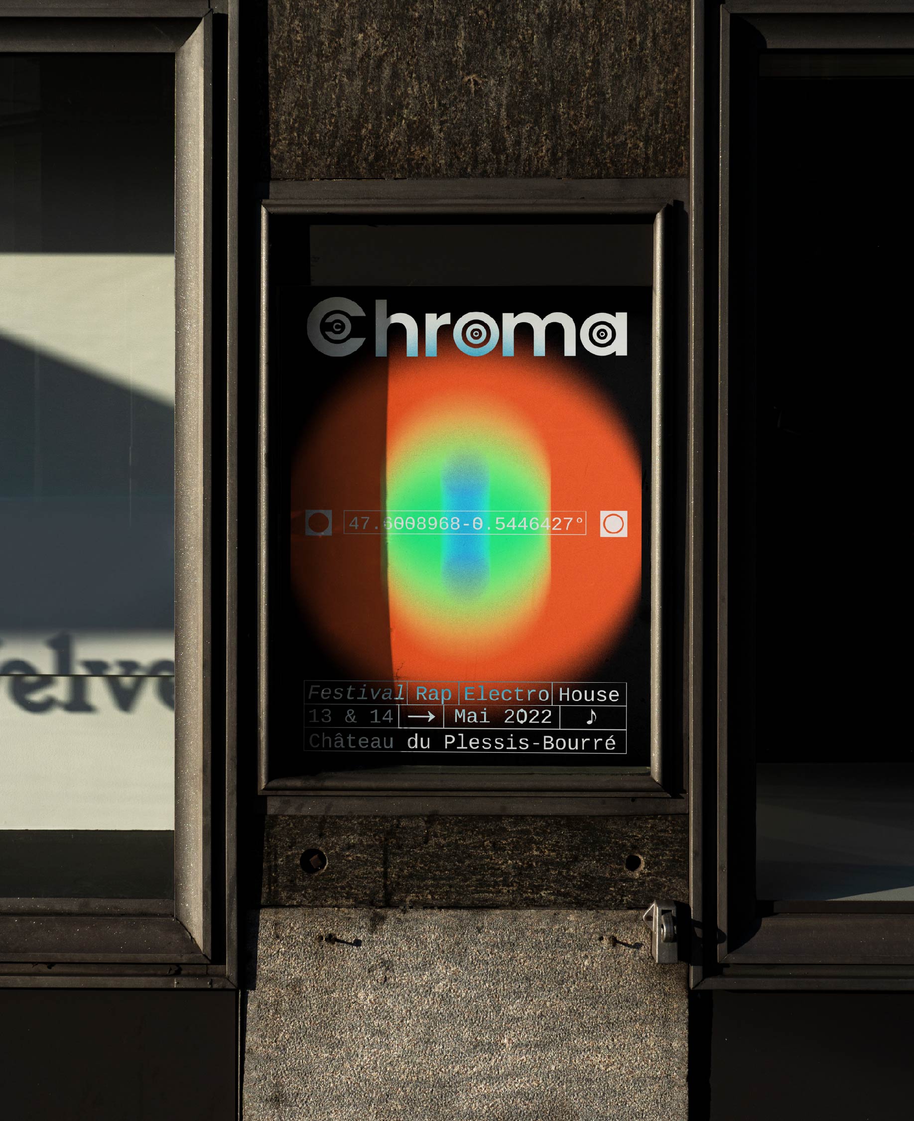 Pour sa première et sa seconde édition, les organisateurs du Chroma Festival m’ont fait appel afin de réaliser l’identité graphique de ce dernier. Lors de sa première édition au printemps 2022, il a résidé les 6 & 7 mai au château du Plessis-Bourré à Écuillé (49). Je leur ai proposé trois pistes de réflexions, qui leur ont permis de se projeter, afin de construire ensemble une imagerie qui reflète l’univers musical de ce festival.