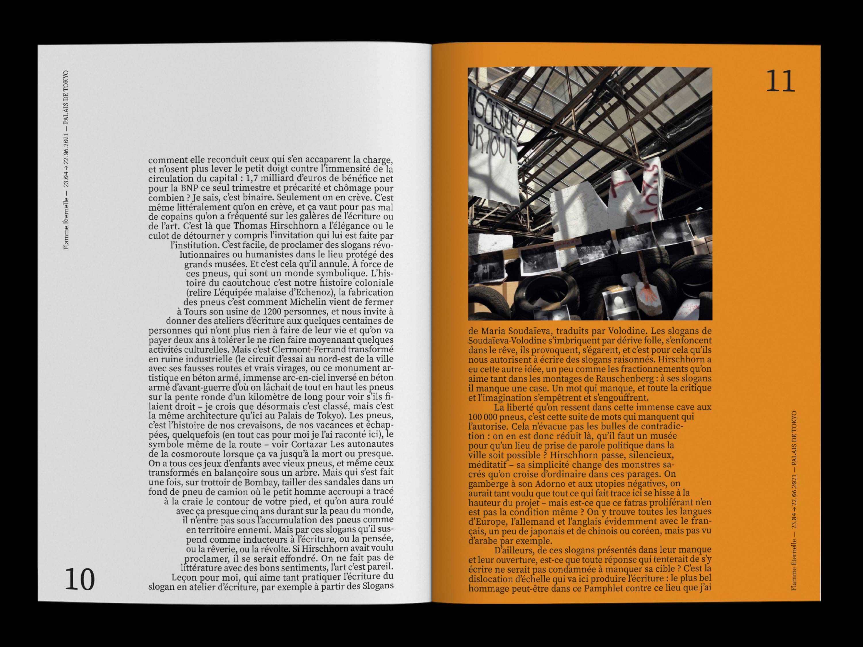 La mise en page interroge la forme circulaire de l'objet pneu disposé en accumulation dans cette installation/ performance. Cette forme circulaire vient rythmer et créer des respirations dans les blocs textes. La couleur ocre omniprésente de page en page, vient, quant à elle rappeler les bandes adhésives de la même tonalité utilisées dans le dispositif scénographique.