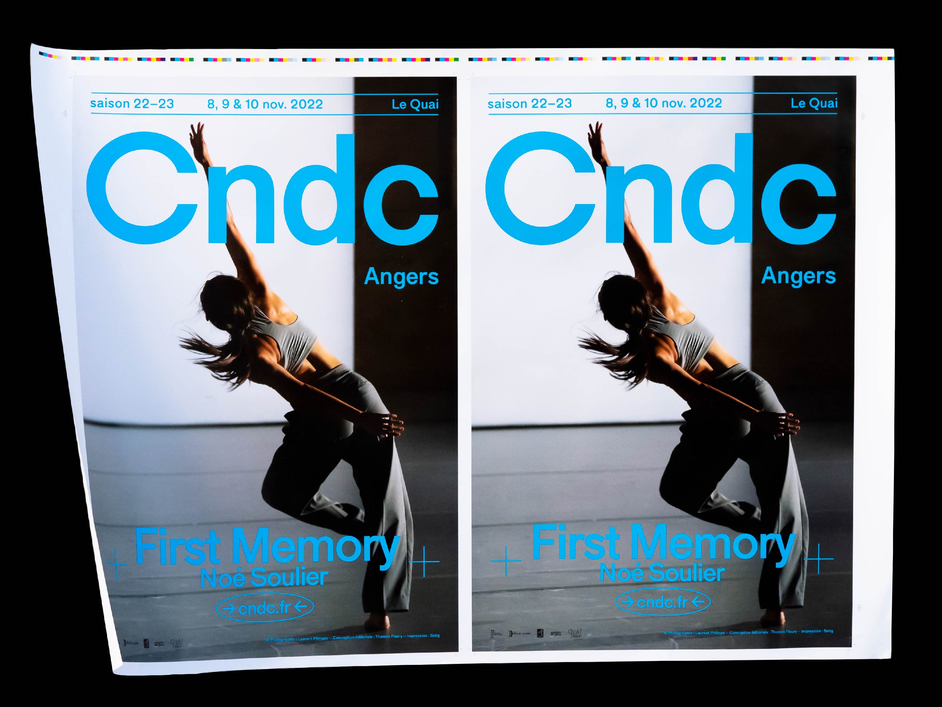 Conception et réalisation de l'affiche de First Memory composé par Noé Soulier (directeur du Cndc-Angers), pour sa première représentation au théâtre Le Quai à Angers.