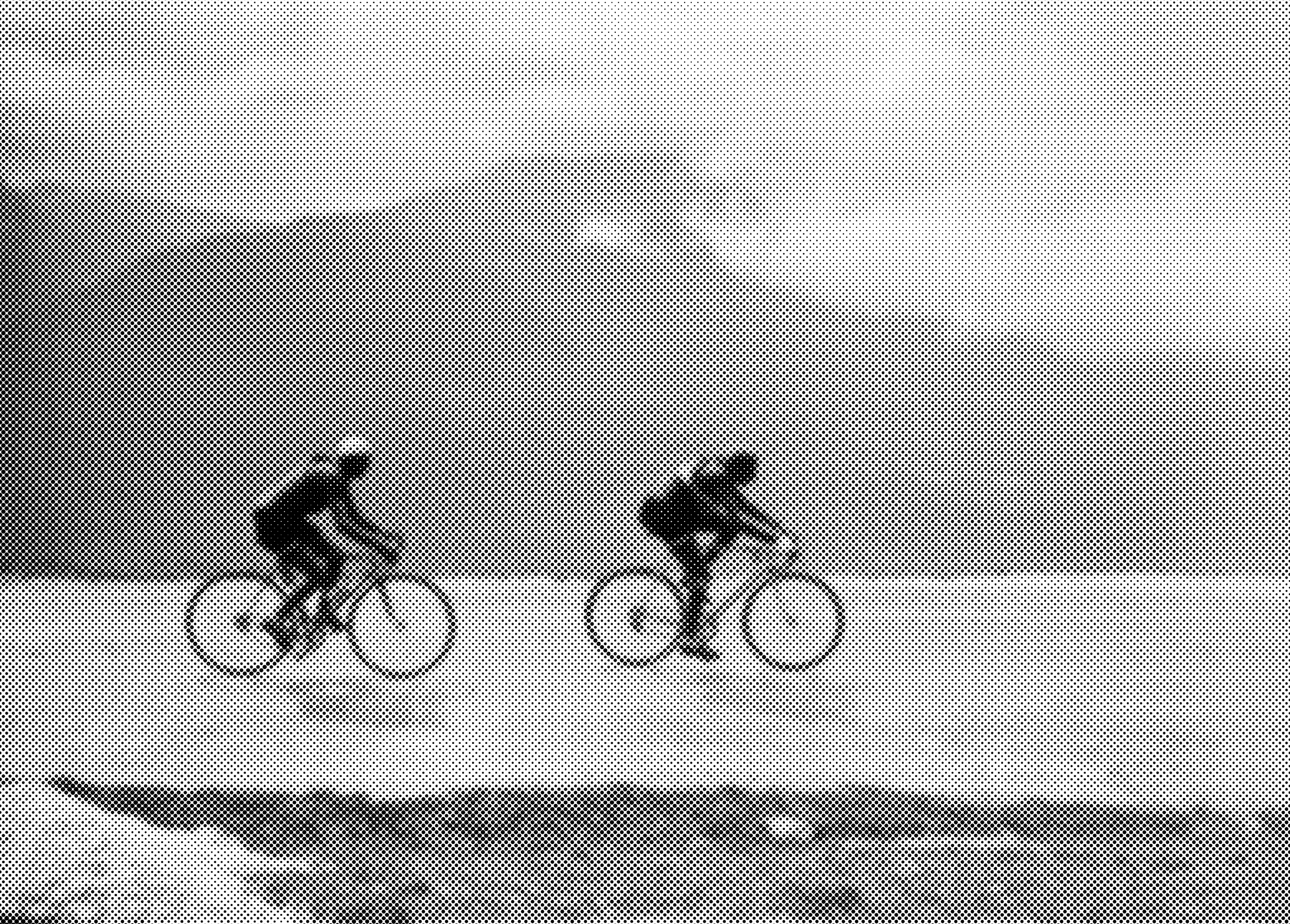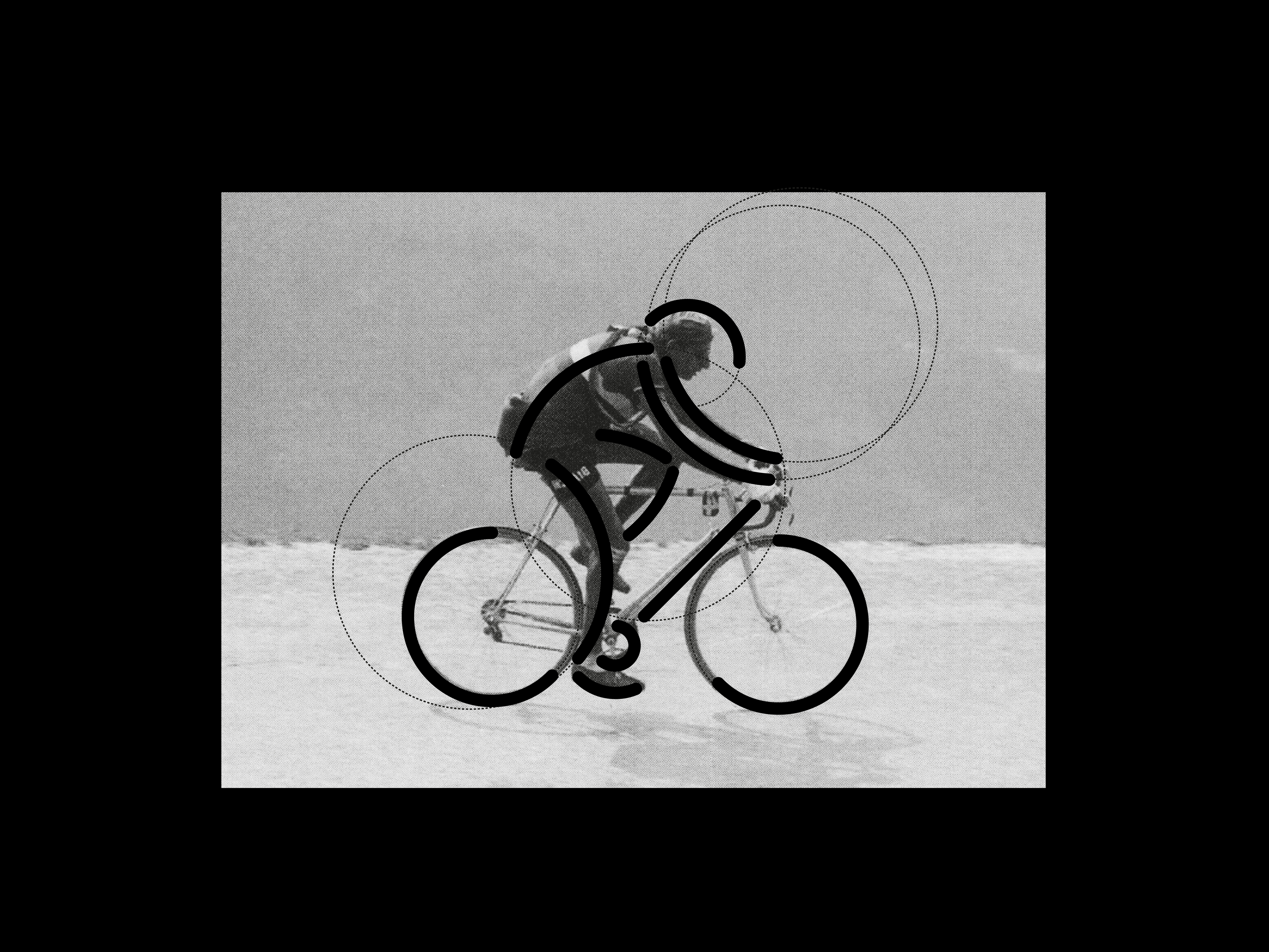 Orienté vers la droite, le graphisme évoque l’élan, la progression, l’entrée et l’échappée. La typographie Fivo en italique accentue cette sensation de vitesse et d’élan, soutenue par un signe figuratif représentant deux cyclistes — l’un qui rejoint, l’autre qui s’élance.