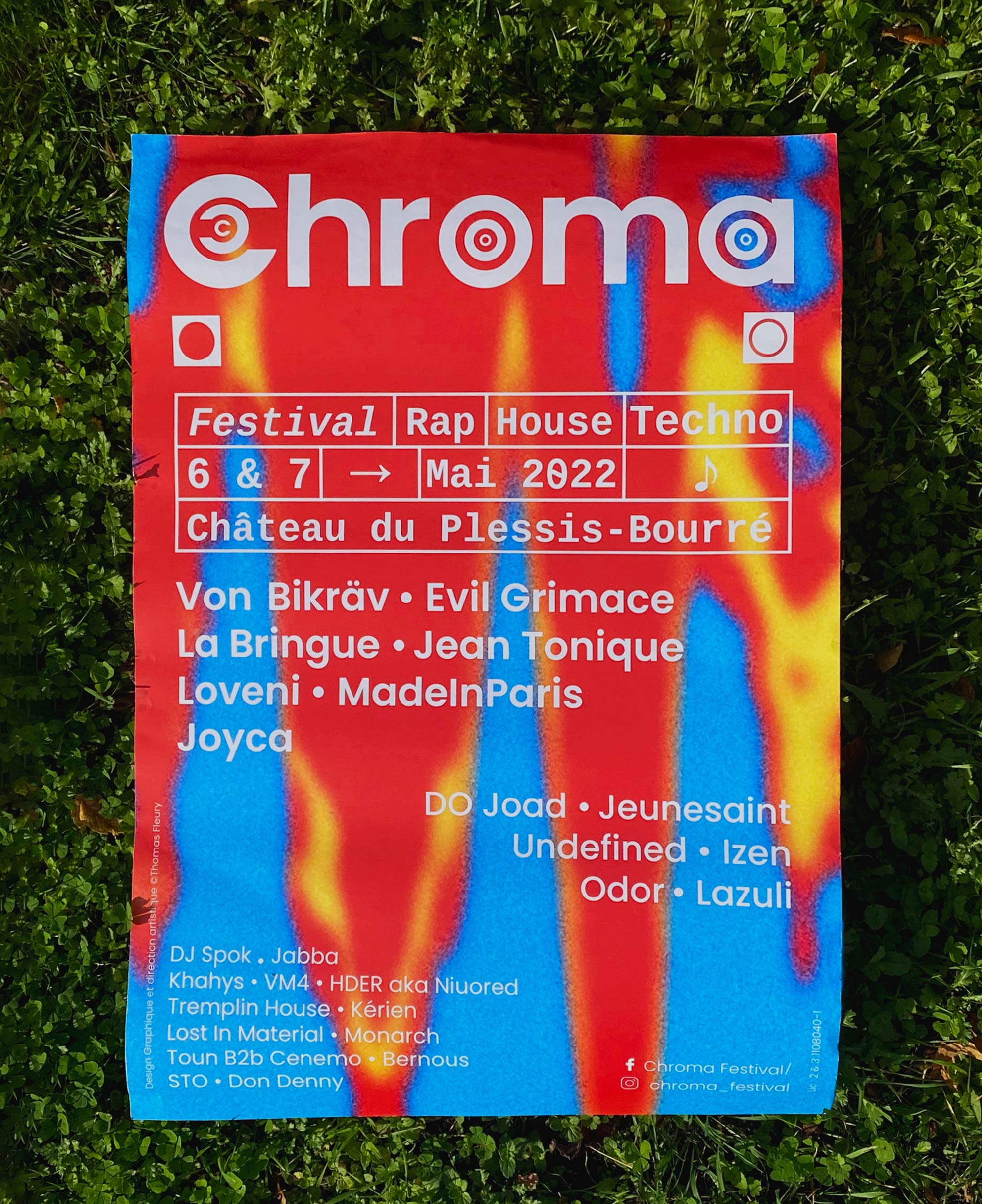 Pour sa première et sa seconde édition, les organisateurs du Chroma Festival m'ont fait appel afin de réaliser l’identité graphique de ce dernier. Lors de sa première édition au printemps 2022, il a résidé les 6 & 7 mai au château du Plessis-Bourré à Ecuillé (49).