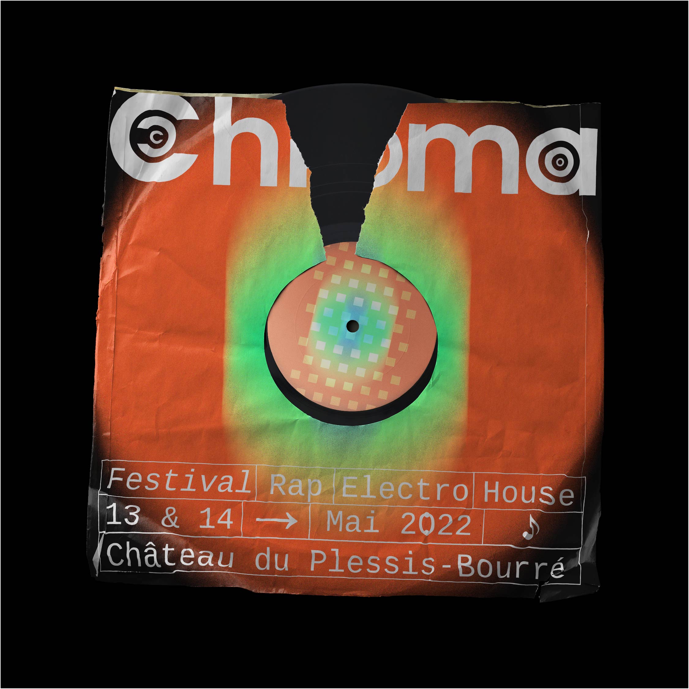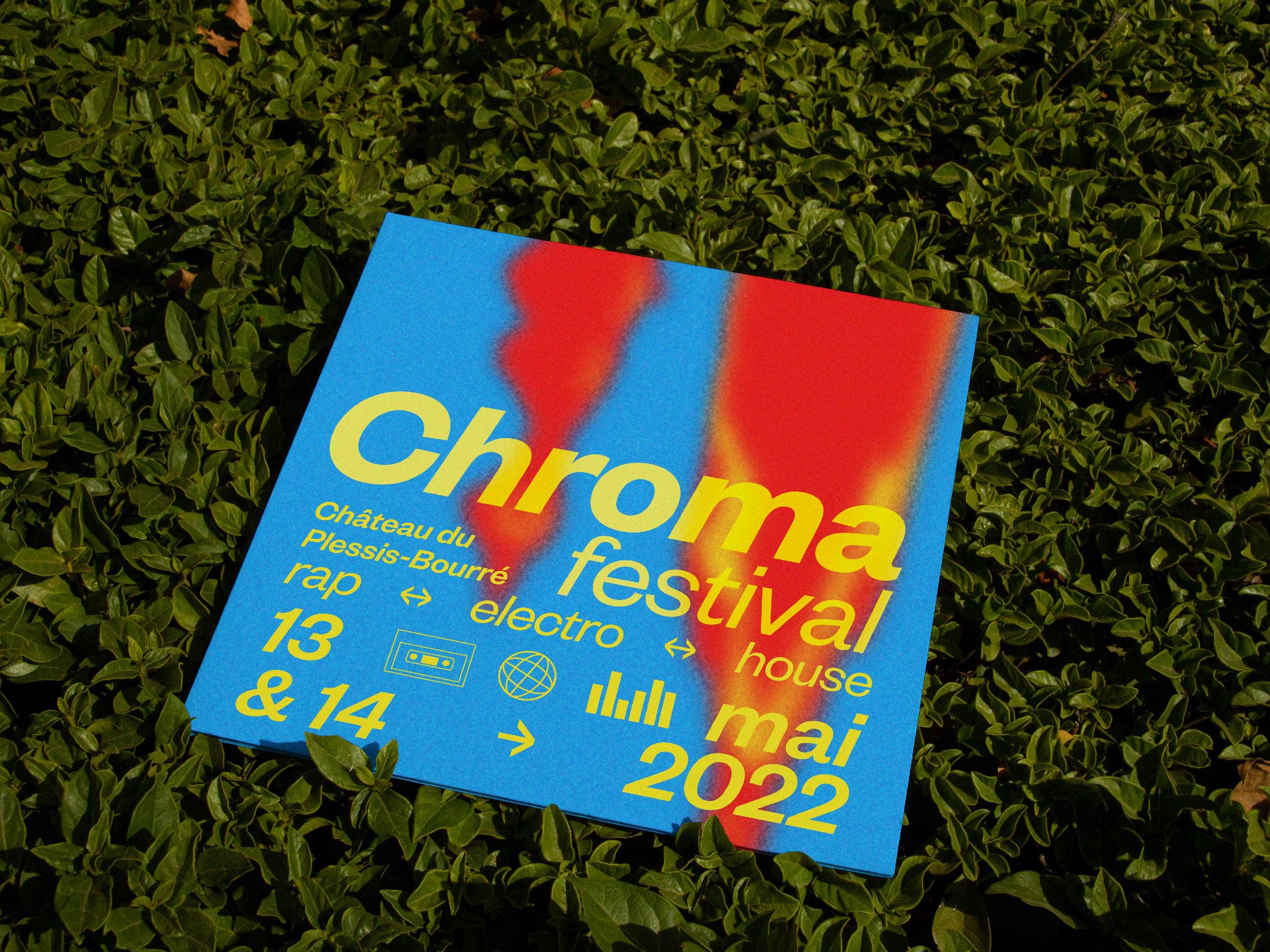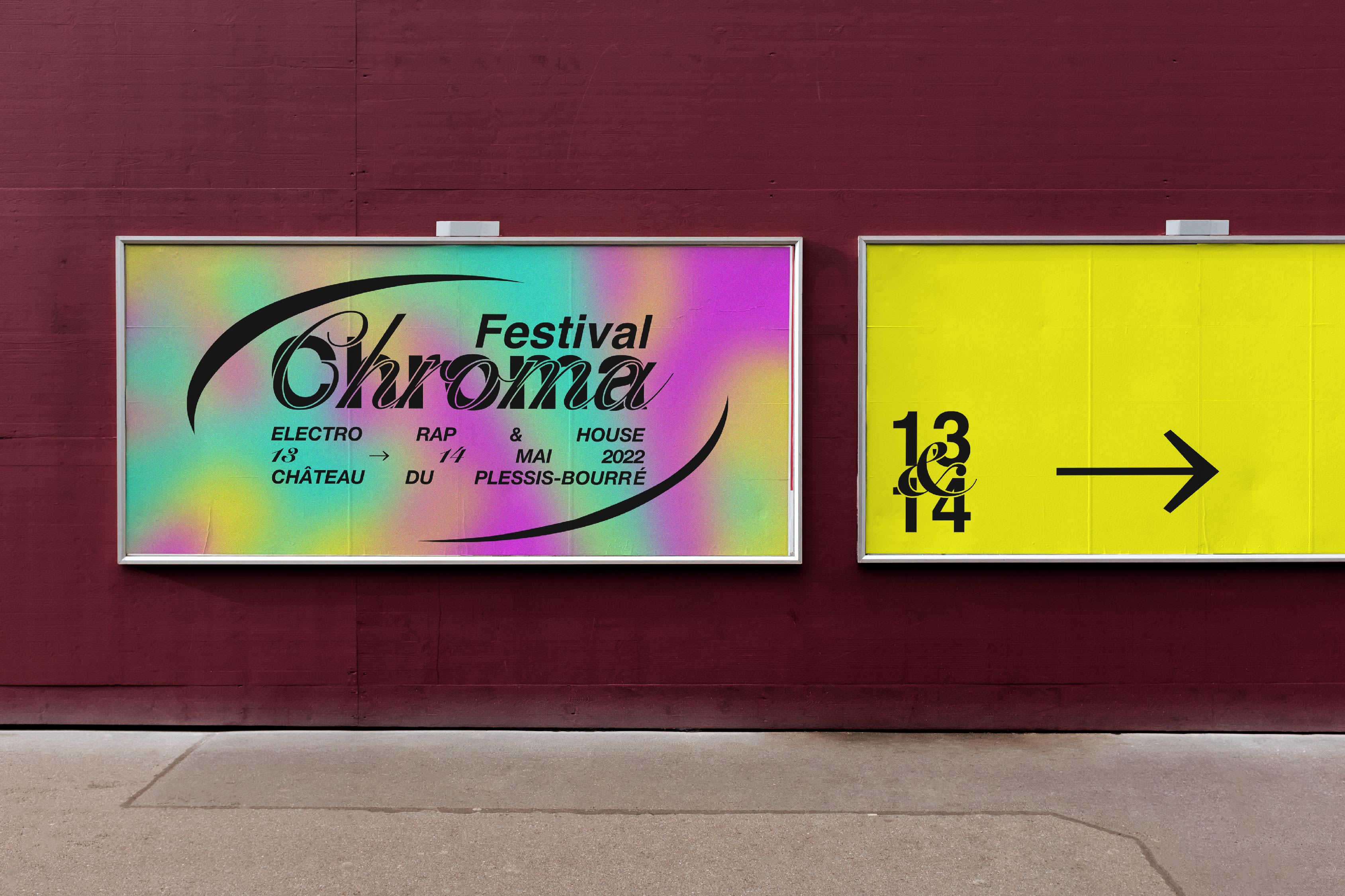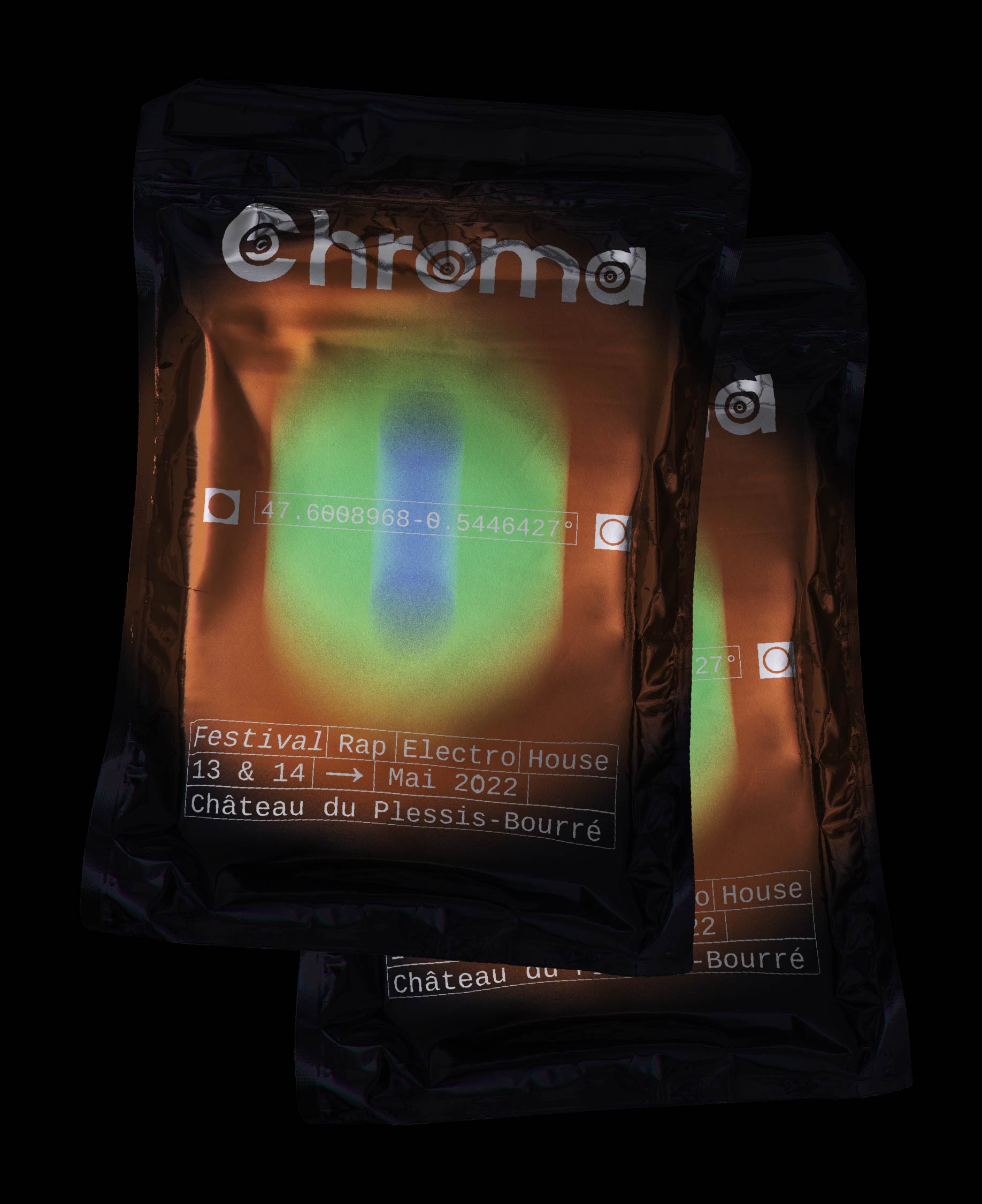Pour sa première et sa seconde édition, les organisateurs du Chroma Festival m’ont fait appel afin de réaliser l’identité graphique de ce dernier. Lors de sa première édition au printemps 2022, il a résidé les 6 & 7 mai au château du Plessis-Bourré à Écuillé (49). Je leur ai proposé trois pistes de réflexions, qui leur ont permis de se projeter, afin de construire ensemble une imagerie qui reflète l’univers musical de ce festival.