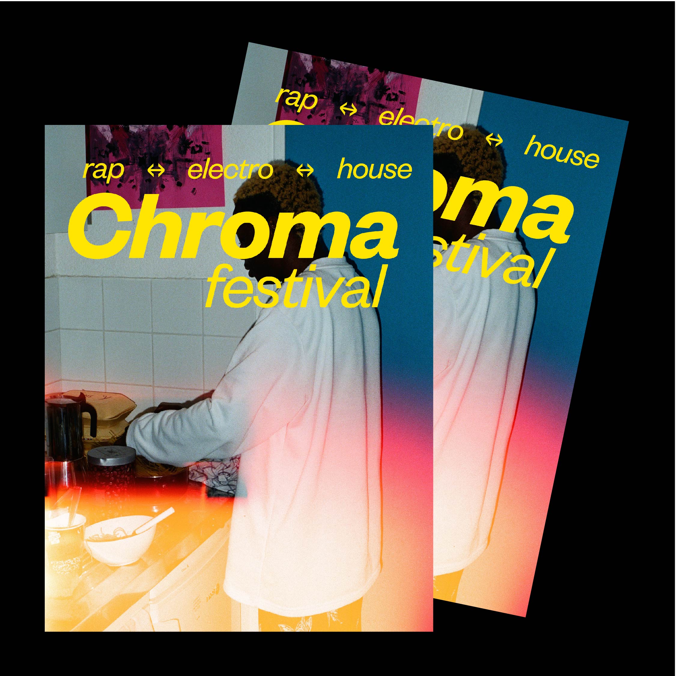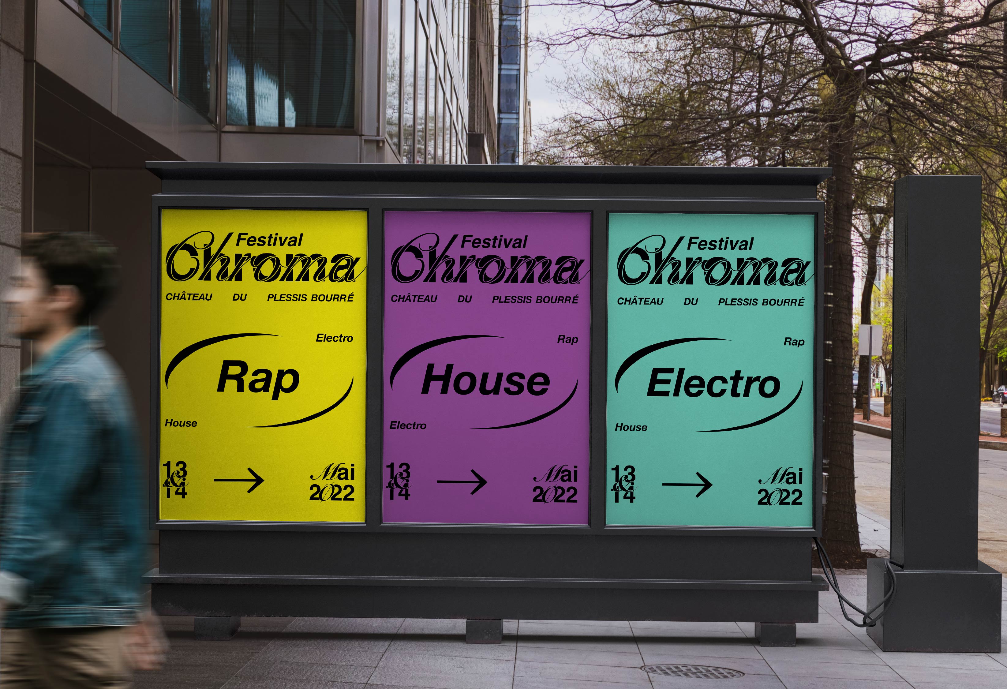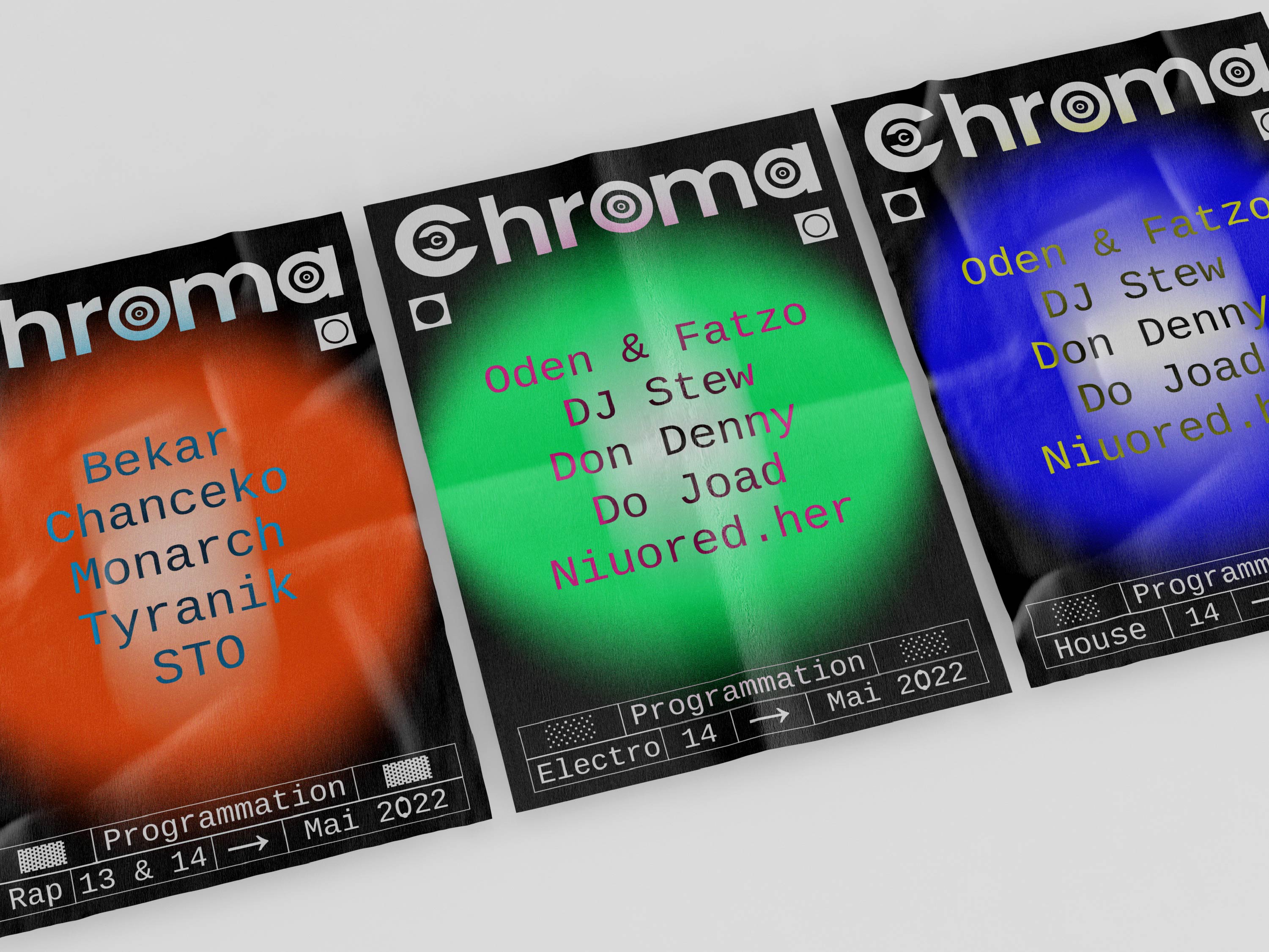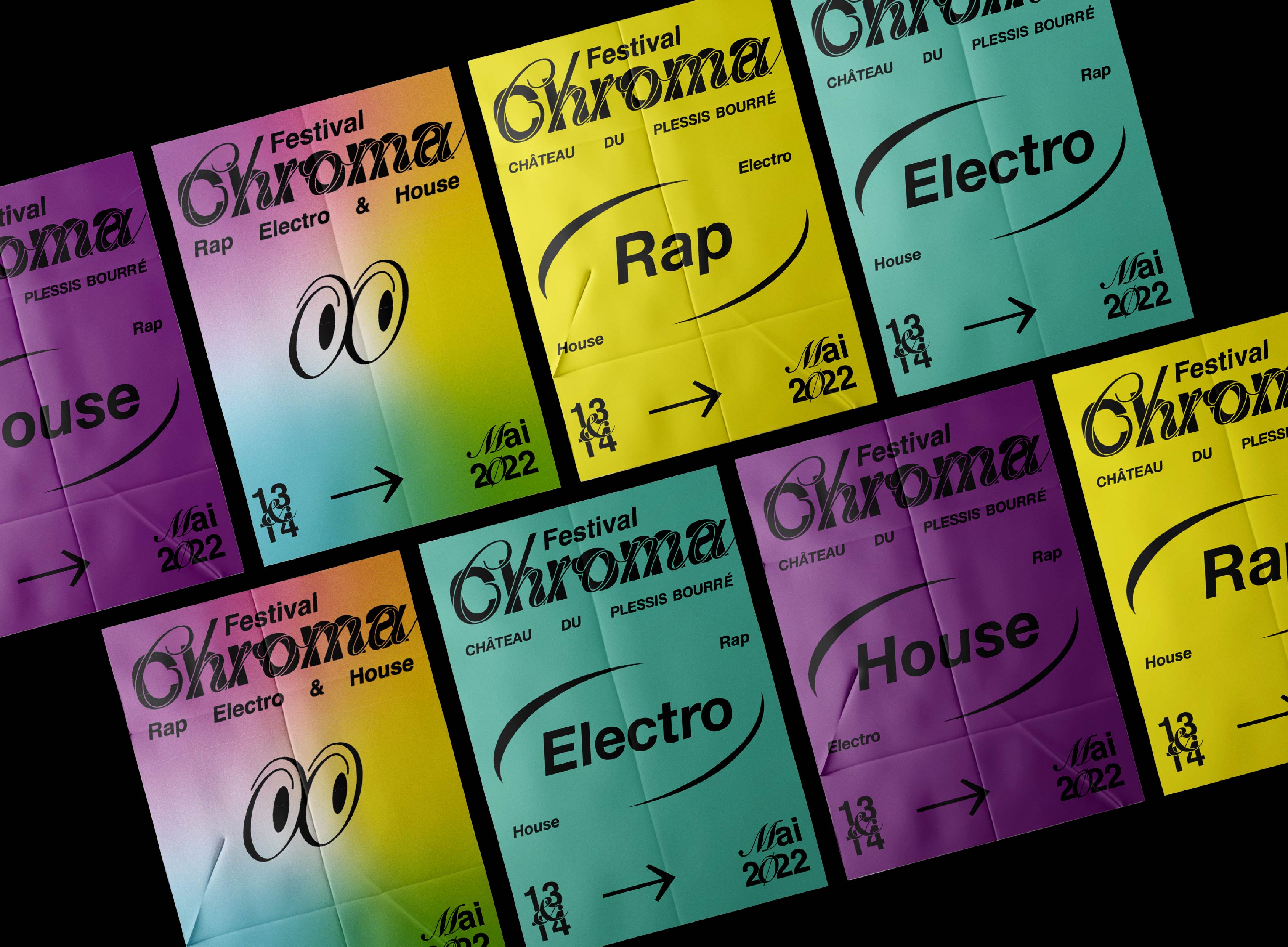 Pour sa première et sa seconde édition, les organisateurs du Chroma Festival m’ont fait appel afin de réaliser l’identité graphique de ce dernier. Lors de sa première édition au printemps 2022, il a résidé les 6 & 7 mai au château du Plessis-Bourré à Écuillé (49). Je leur ai proposé trois pistes de réflexions, qui leur ont permis de se projeter, afin de construire ensemble une imagerie qui reflète l’univers musical de ce festival.