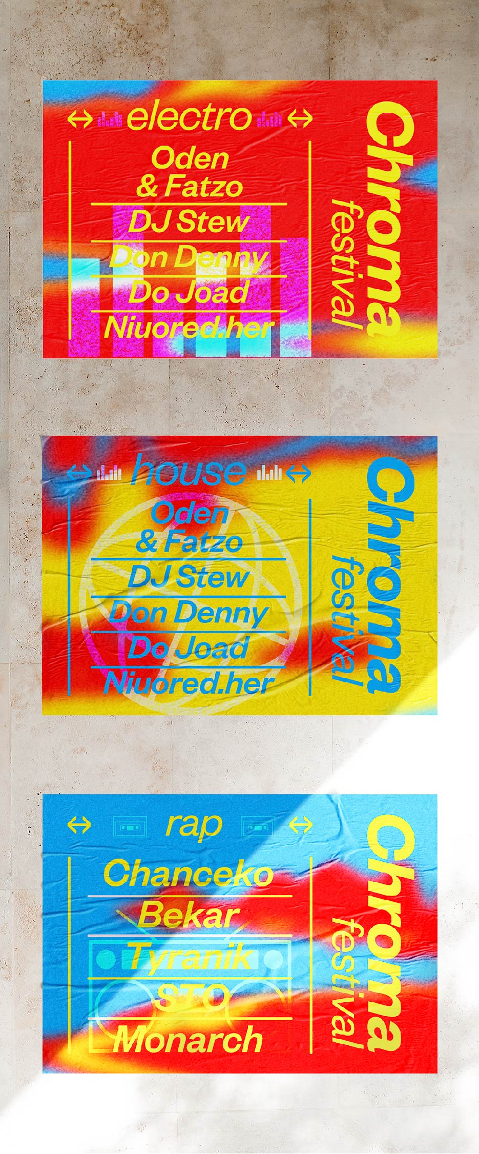 Ce système graphique joue des trois couleurs primaires en aberration. Ce mélange chromatique fait référence aux 3 secteurs musicaux qui viennent se rencontrer, se mélanger. Le système typographique s’articule autour d’une linéale grotesk, italique. Elle induit du mouvement, celui des festivaliers·ères dans l’enceinte du festival.