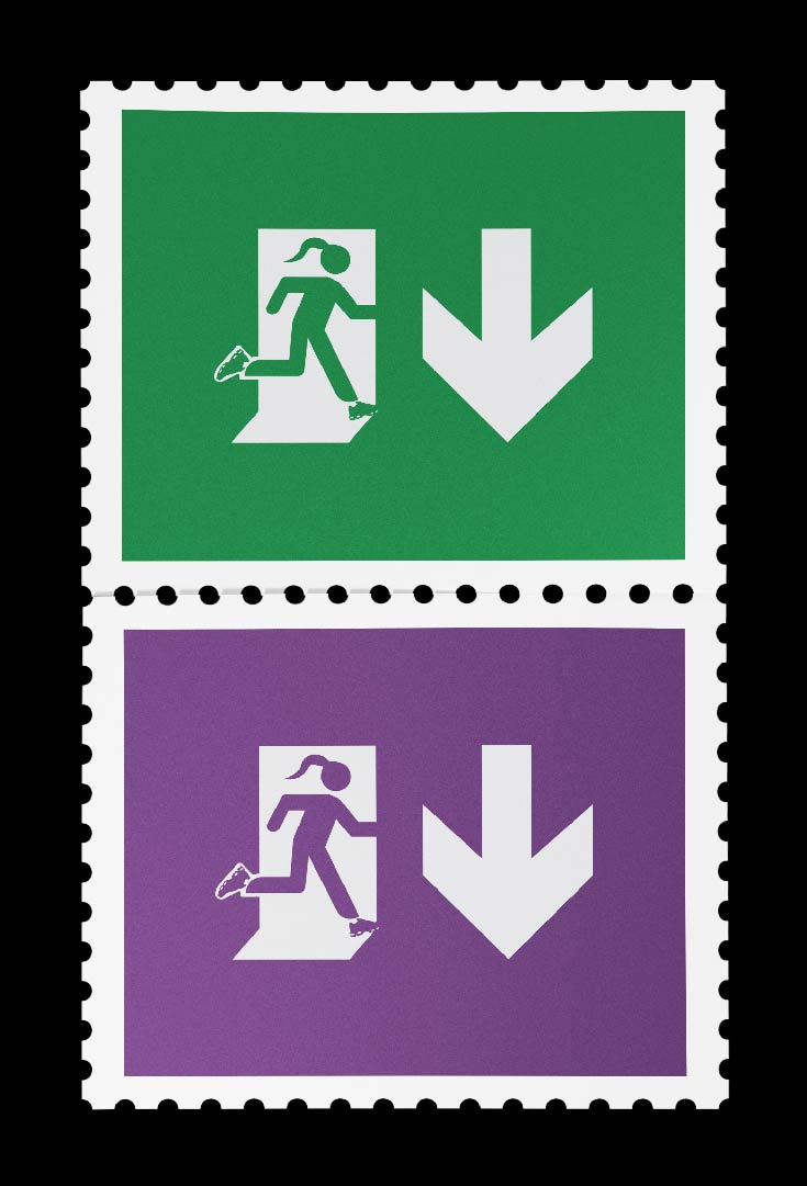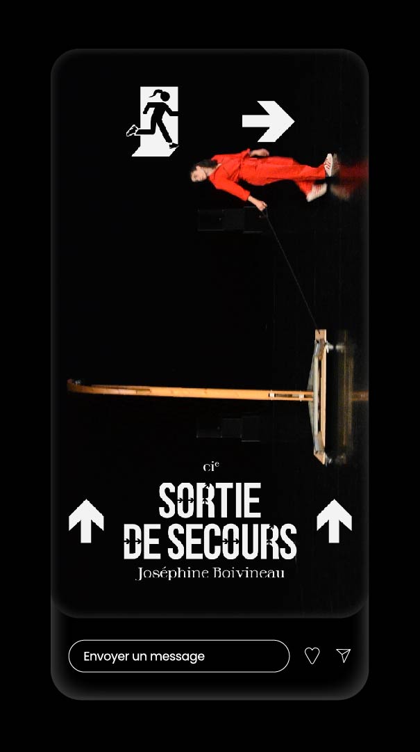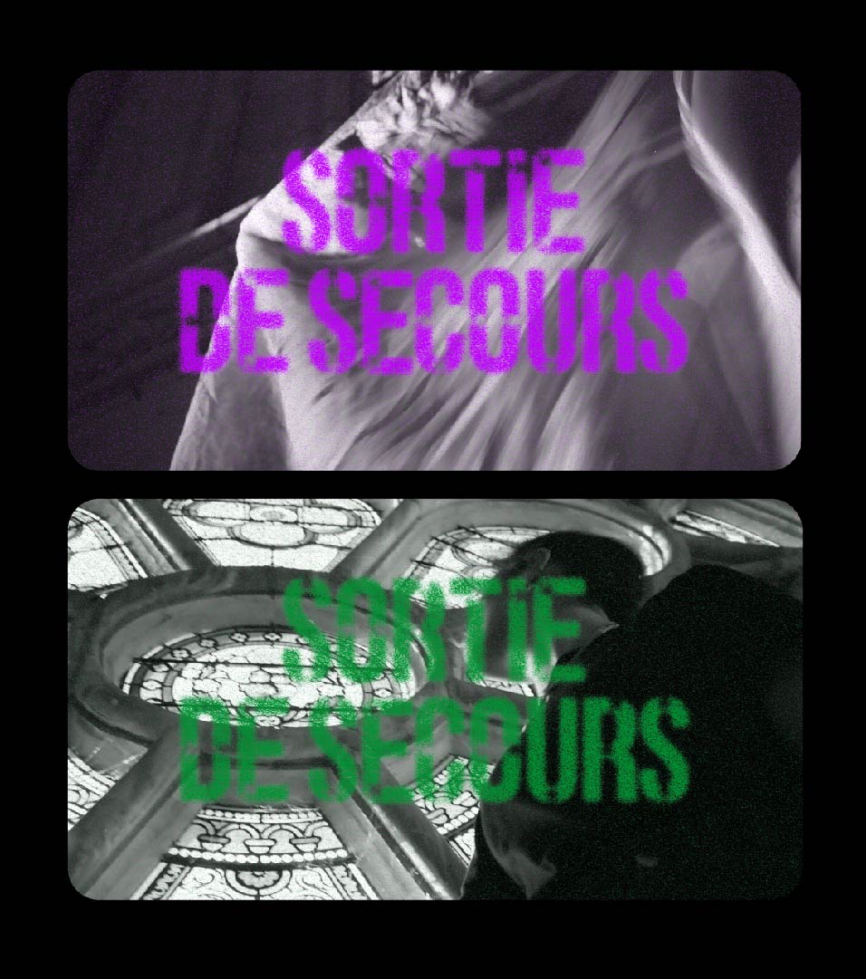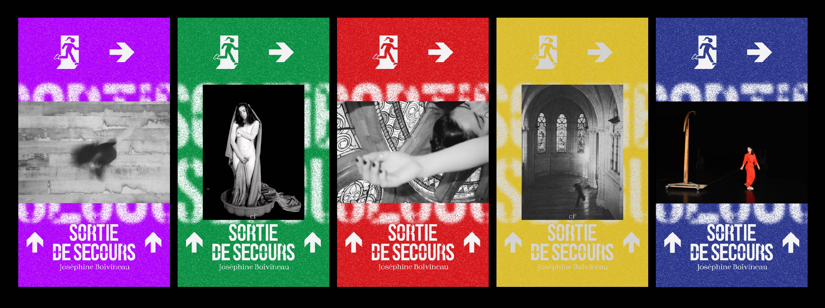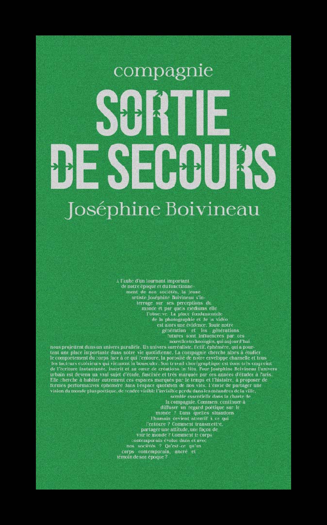 La Compagnie Sortie de Secours est portée par Joséphine Boivineau qui est artiste danseuse & chorégraphe. J’ai réalisé son identité graphique en tirant des références visuelles du langage populaire de la borne de signalisation “Sortie de Secours” et des codes couleurs des normes de sécurité.