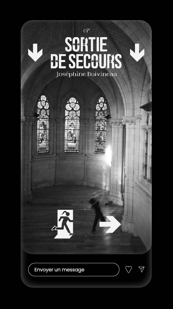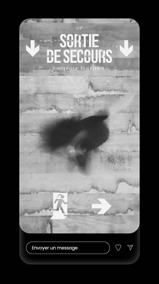 Joséphine Boivineau intervient dans des périmètres urbains, elle performe là où le public ne s’y attend pas. Elle crée des issues de secours dans le quotidien des gens. Dans la rue, là où le public est surpris. La seule lumière qui reste quand le noir intervient sur scène, c’est celle de la borne SDS. Mais dans la rue, les sorties de secours sont-elles partout ?