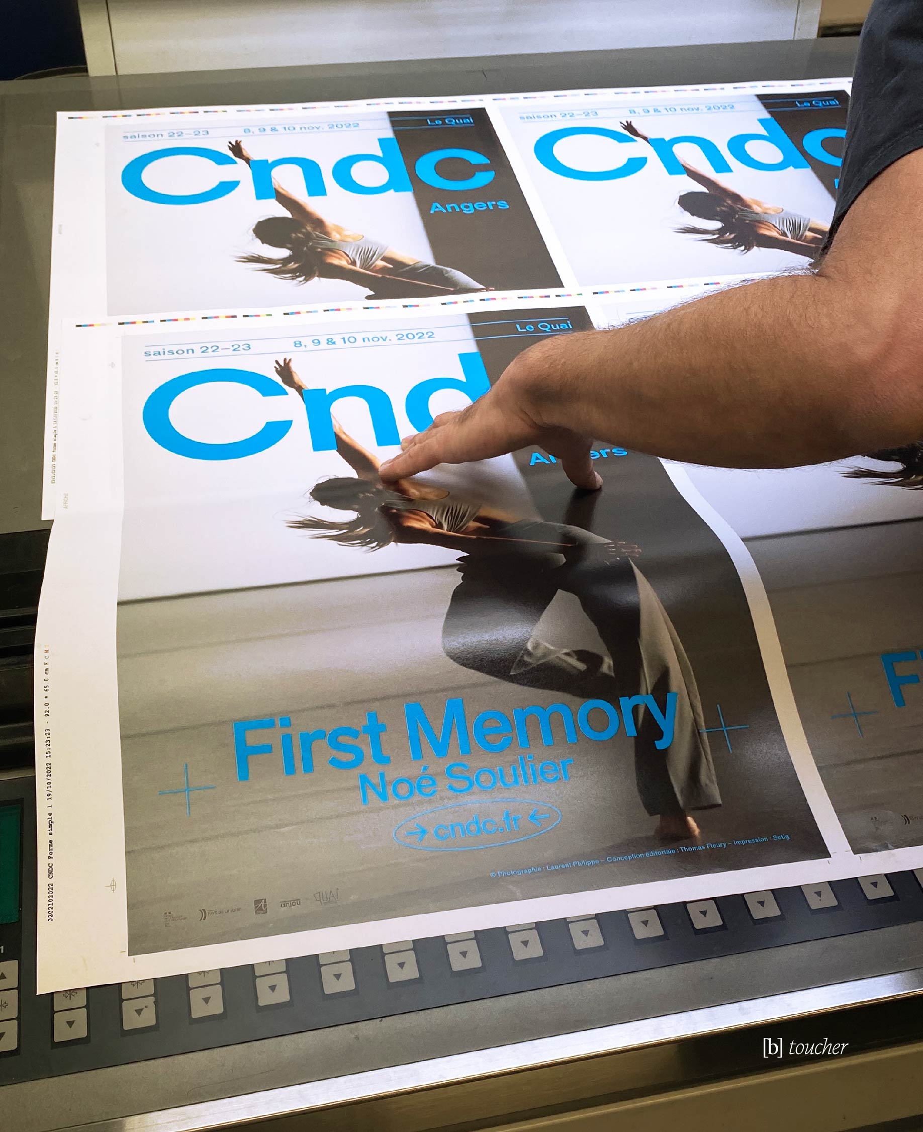 Conception et réalisation de l'affiche de First Memory composé par Noé Soulier (directeur du Cndc-Angers), pour sa première représentation au théâtre Le Quai à Angers.