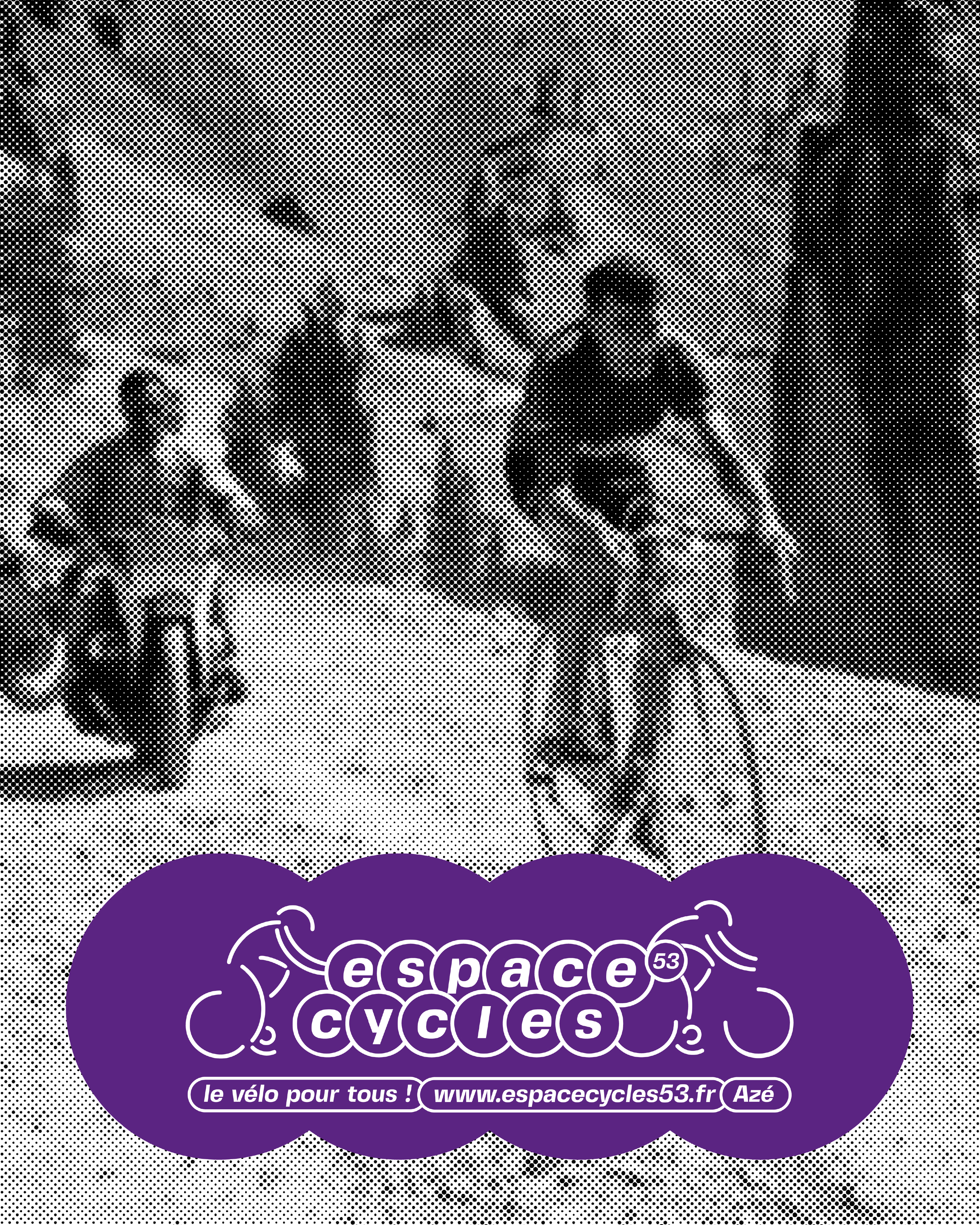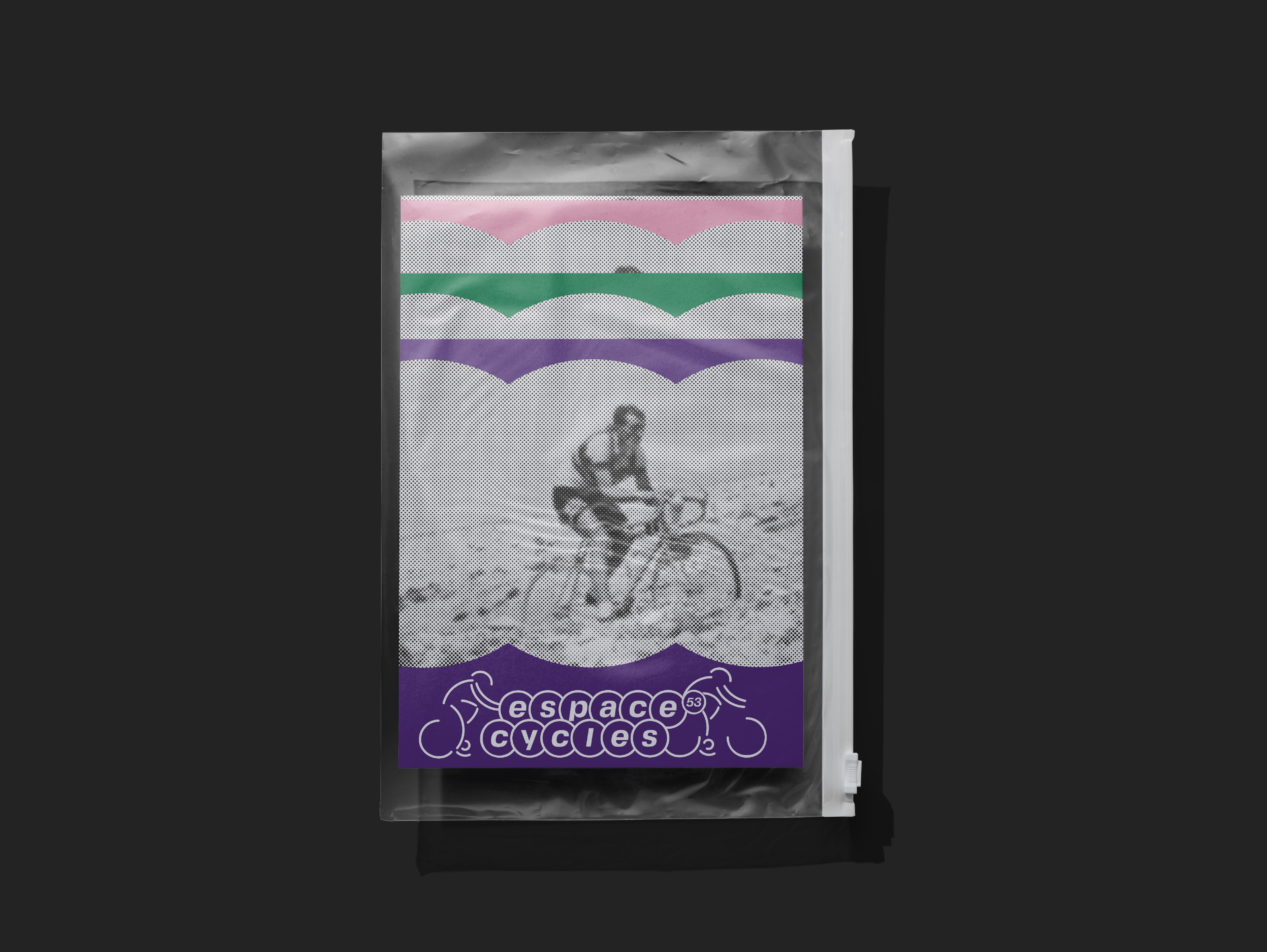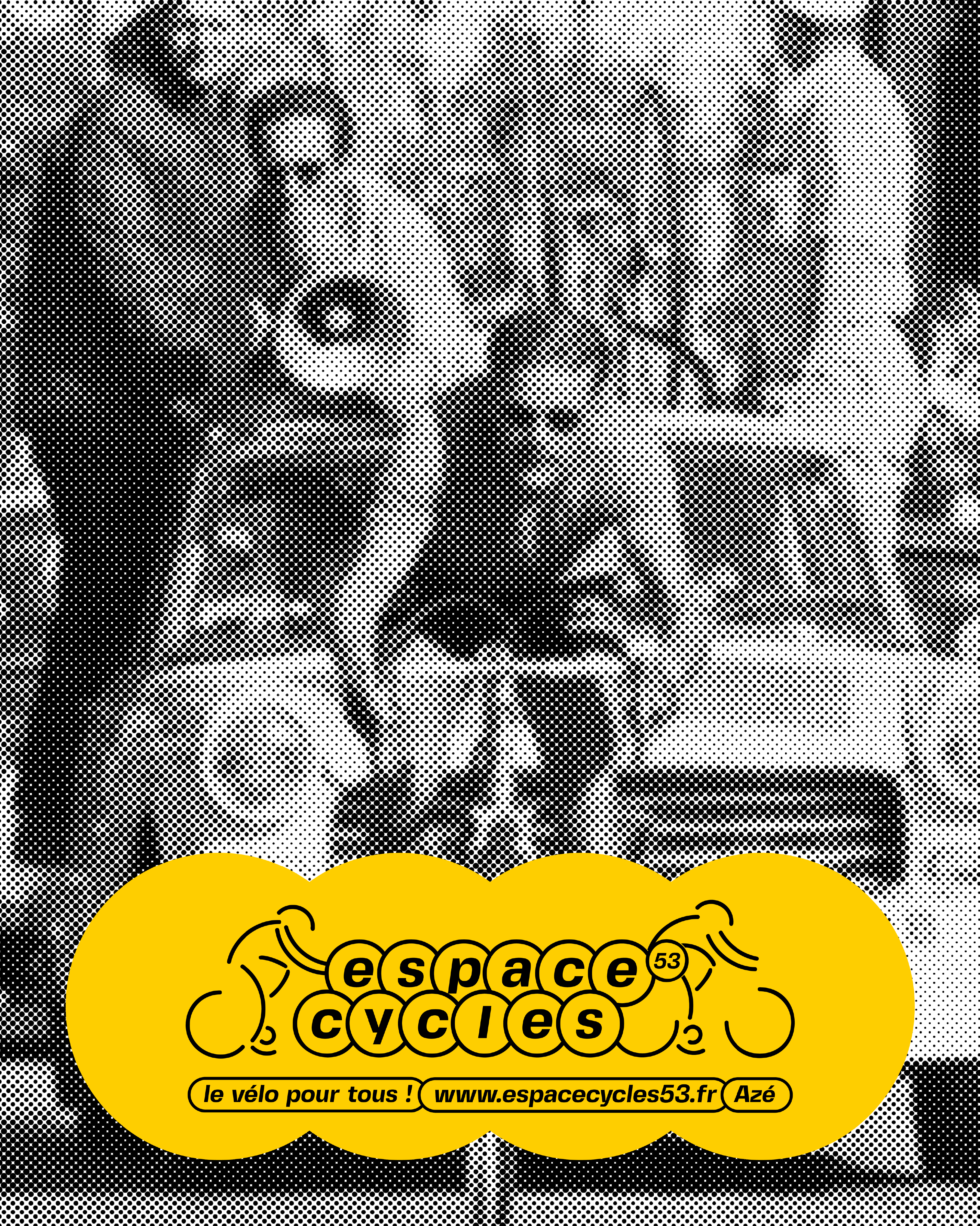 Orienté vers la droite, le graphisme évoque l’élan, la progression, l’entrée et l’échappée. La typographie Fivo en italique accentue cette sensation de vitesse et d’élan, soutenue par un signe figuratif représentant deux cyclistes — l’un qui rejoint, l’autre qui s’élance.