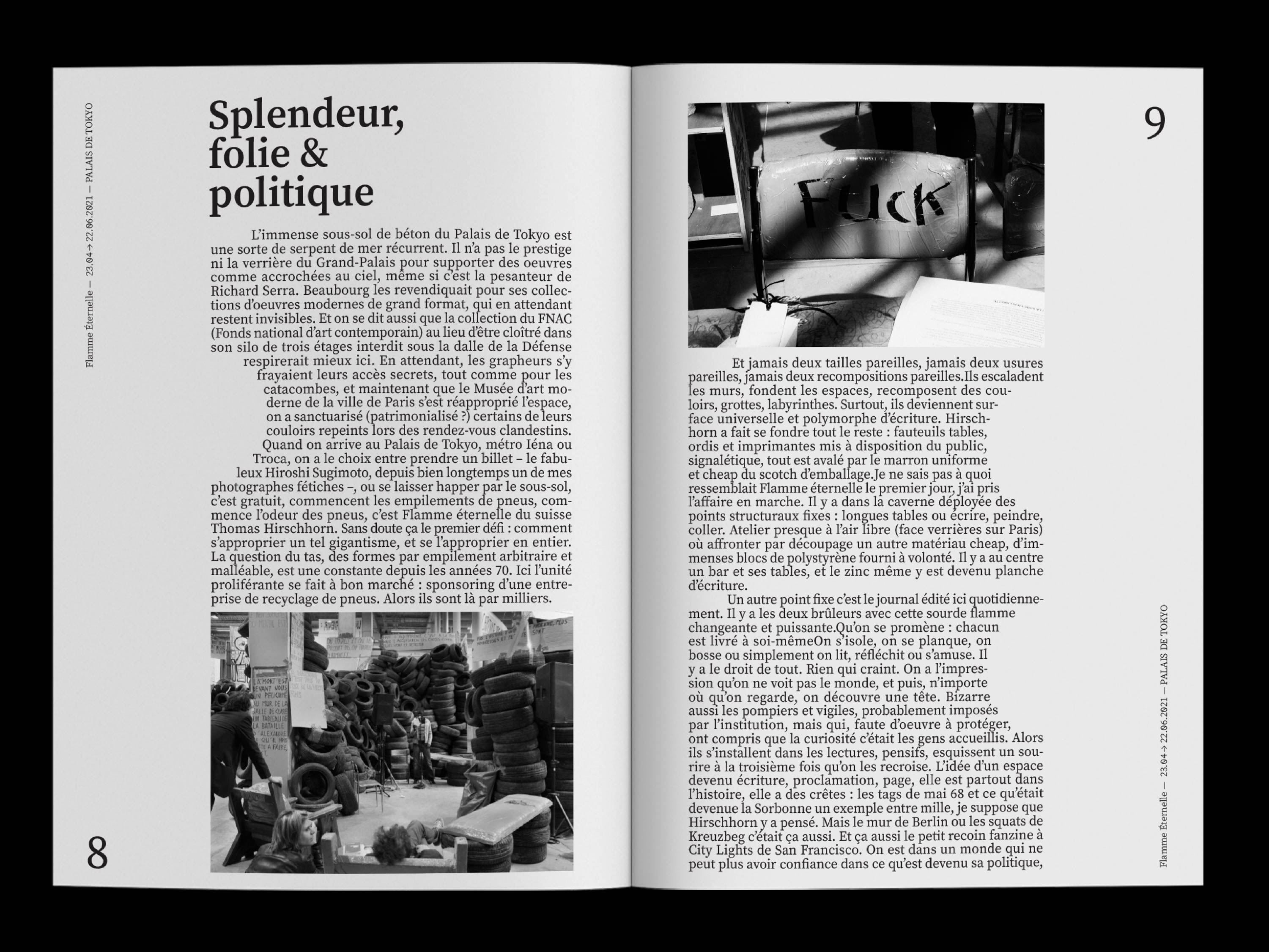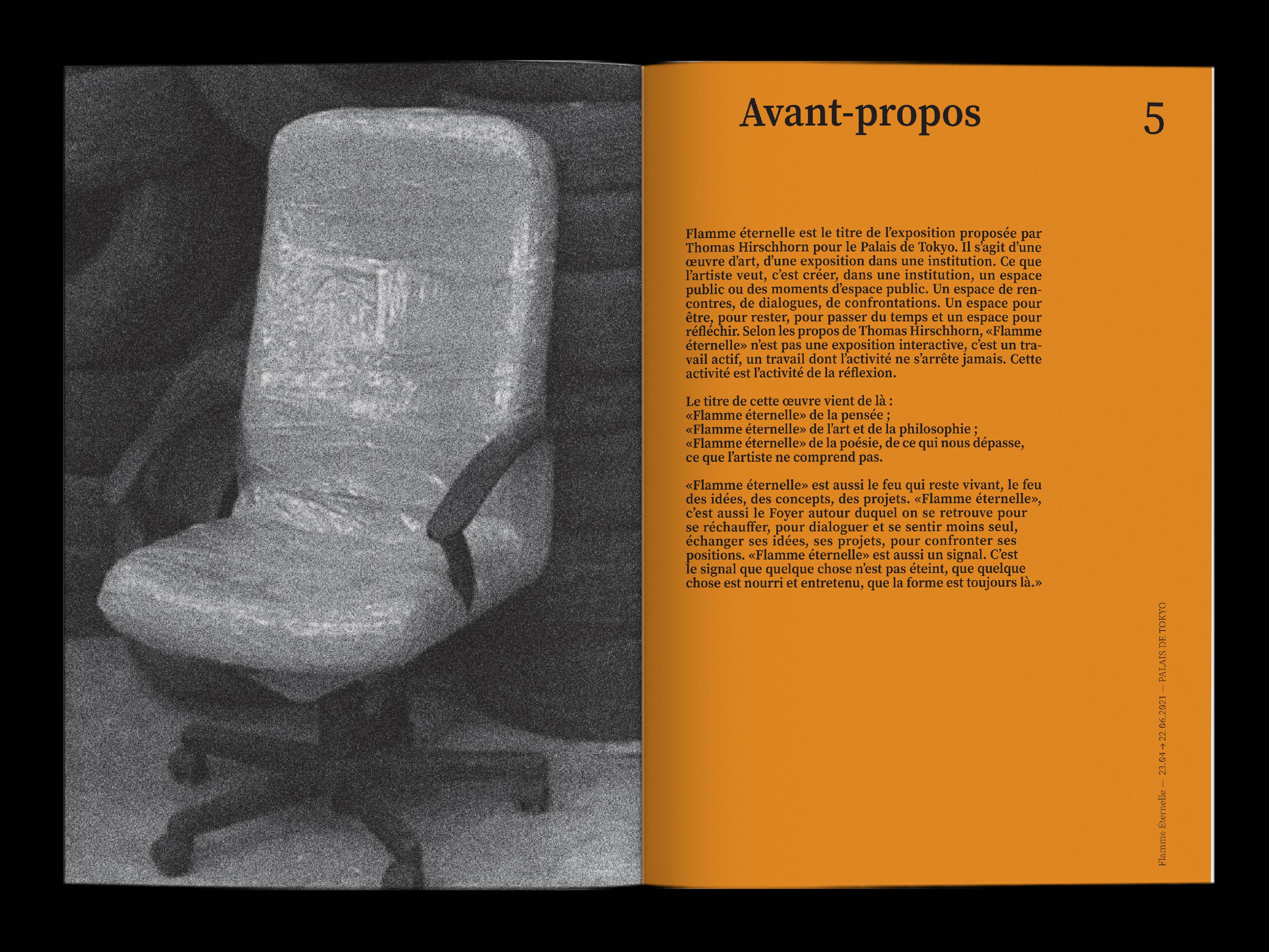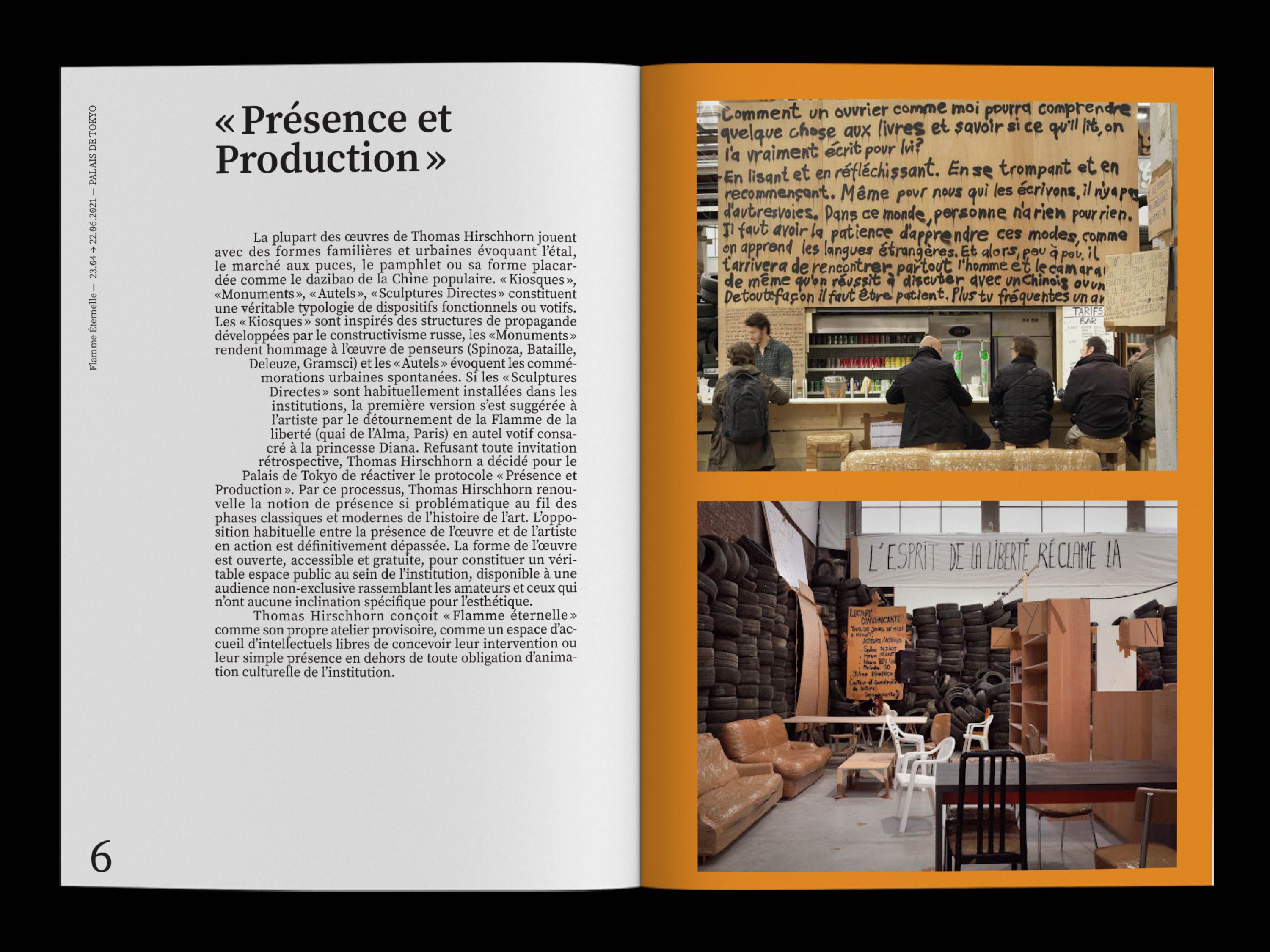 Flamme Éternelle est un catalogue d’exposition au format poche. Il présente l’installation de Thomas Hirschhorn – du même nom – au Palais de Tokyo.