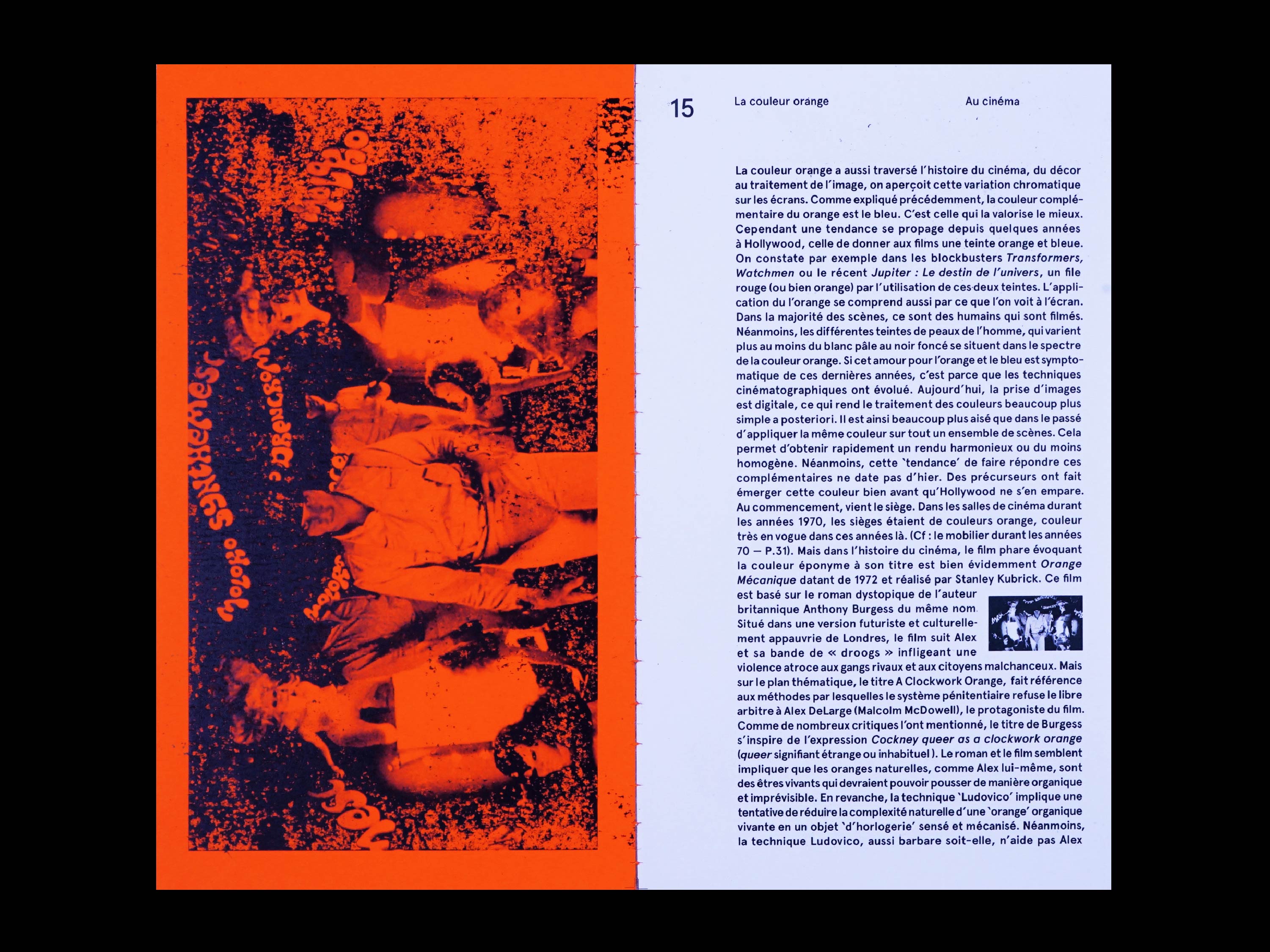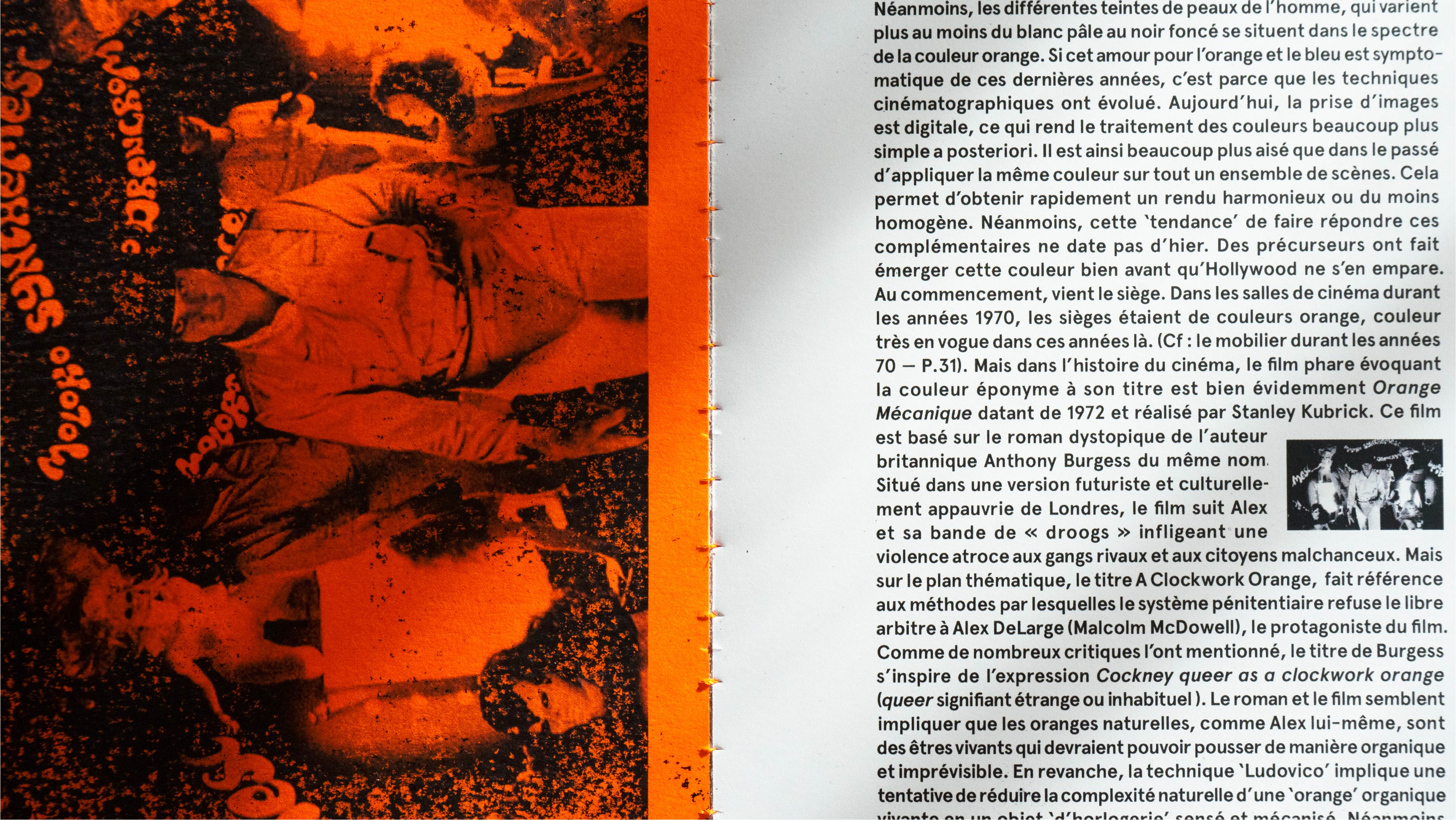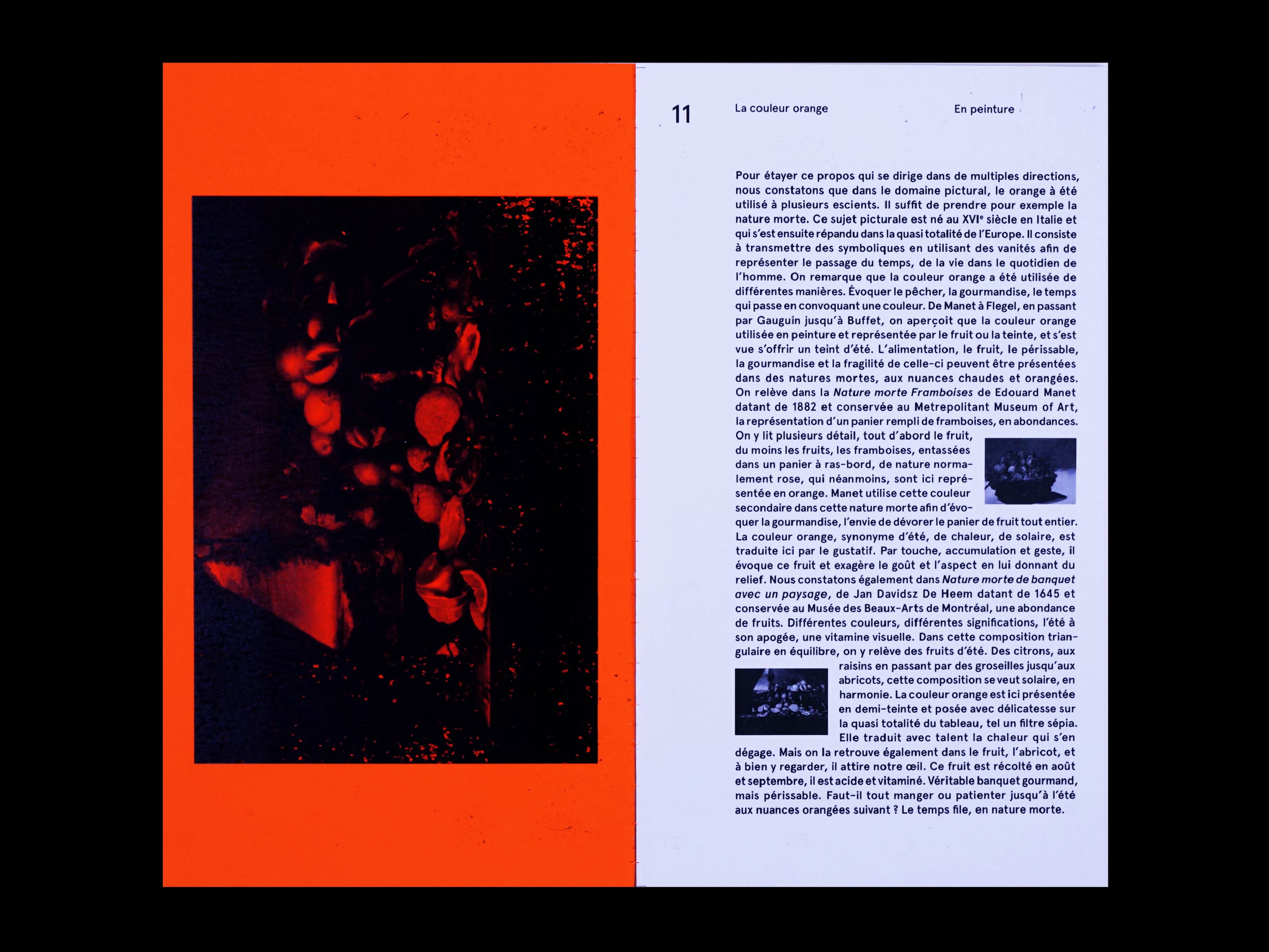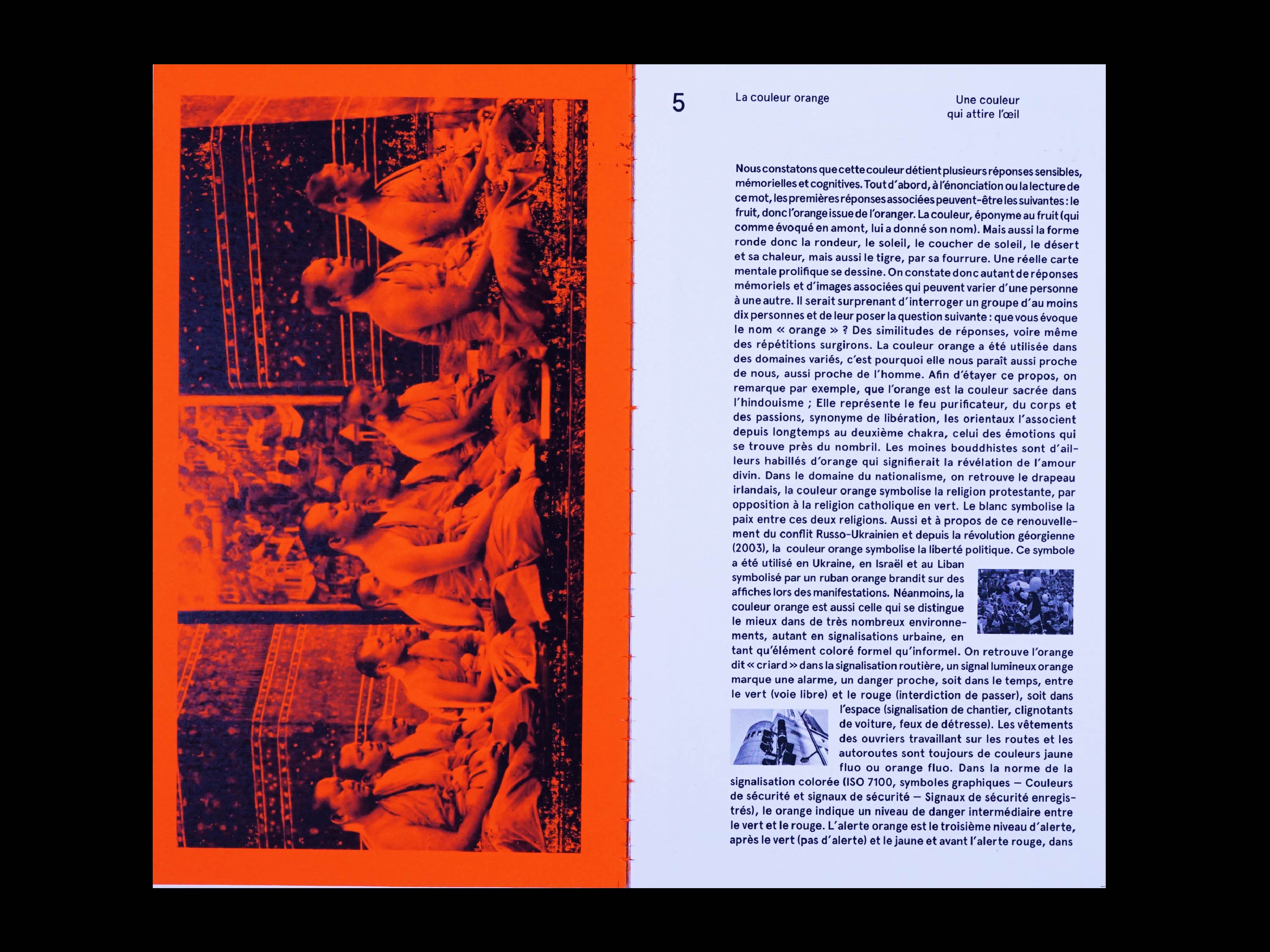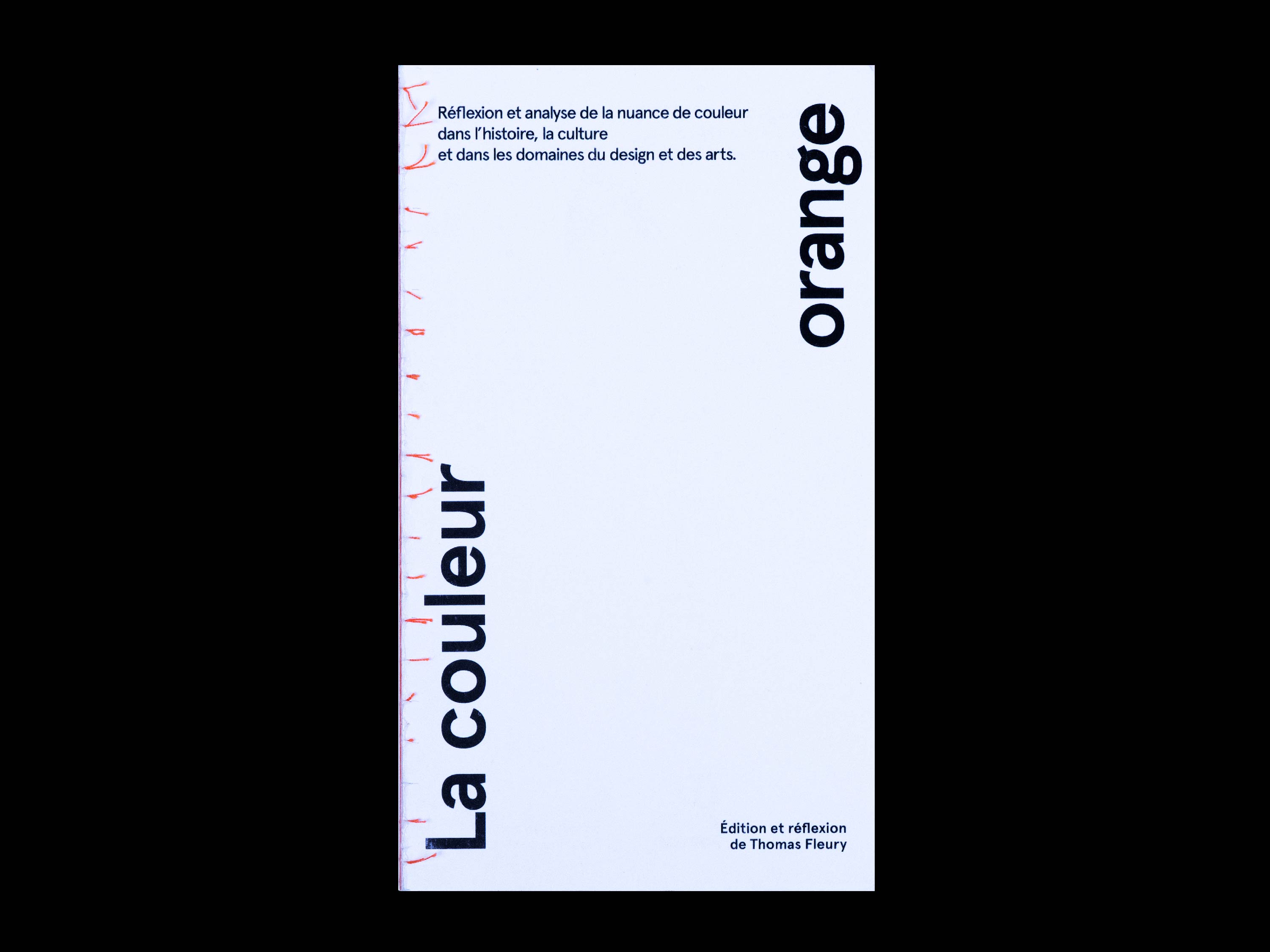La couleur orange est une édition au format 11,5 x 20,5 cm, doté d’une sur-couverture en papier de riz et reliée en dos carré-collé à la main. Elle synthétise une réflexion et une analyse en regard de cette nuance de couleur et de son utilisation dans les domaines du design et des arts visuels. Elle retrace l’utilisation de cette nuance dans les champs picturaux, cinématographiques, durant les années soixante-dix et dans la communication visuelle.