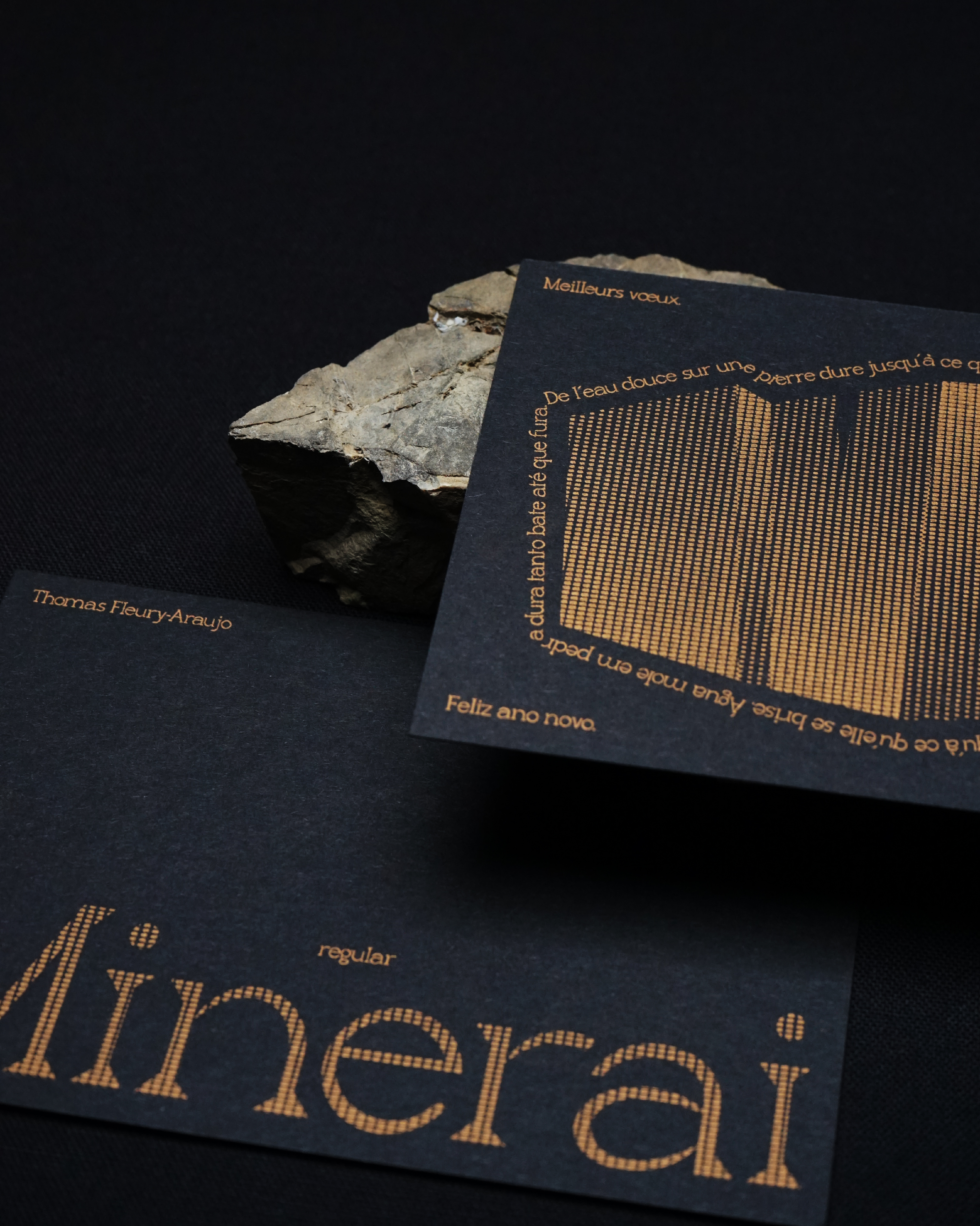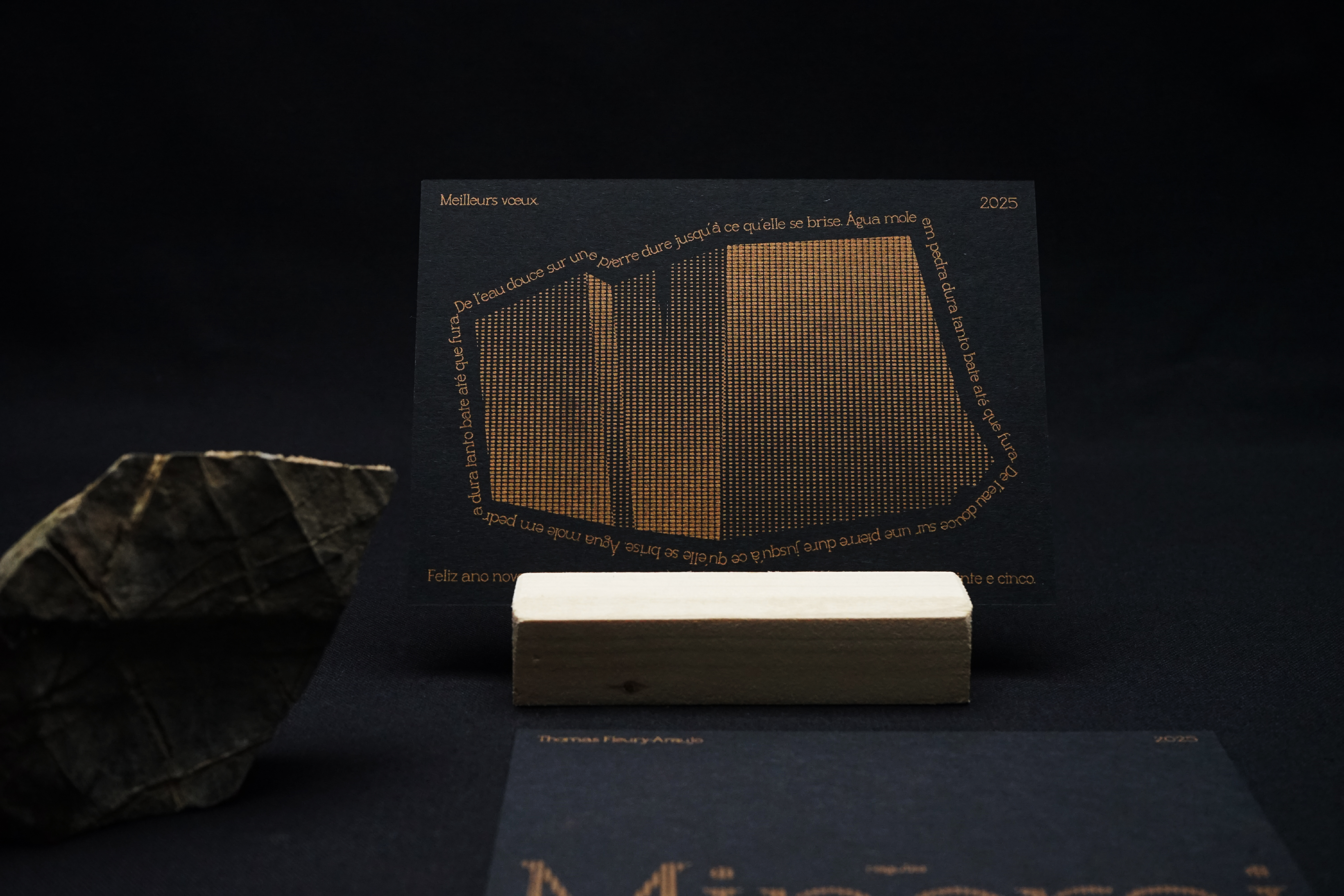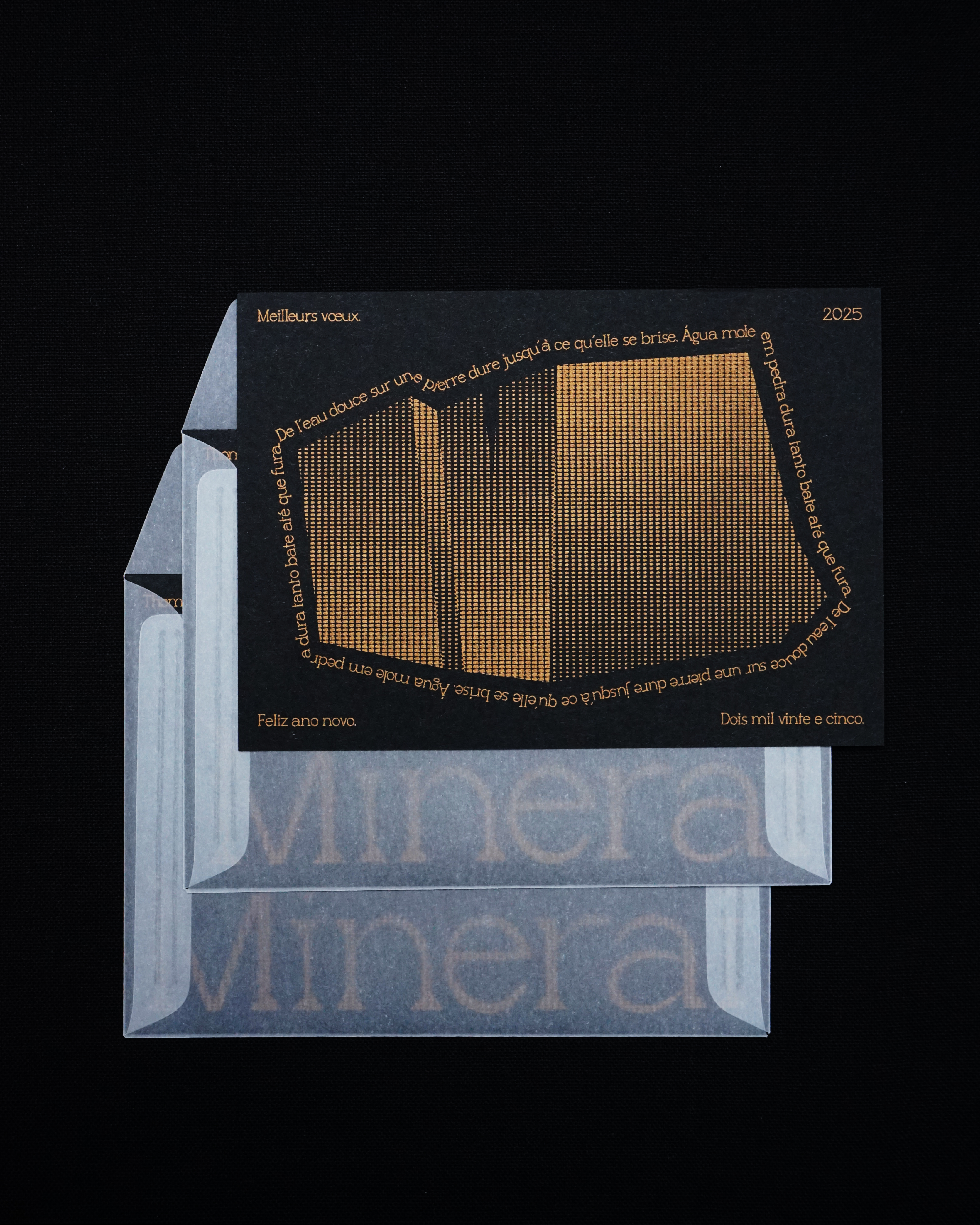Cette carte de vœux, composée en Minerai, s'inspire de l'adage portugais “de l'eau douce sur une pierre dure jusqu'à ce qu'elle se brise", "Água mole em pedra dura tanto bate até que fura". Elle symbolise la persévérence : face à une tâche ou une action, la constance finit toujours par porter ses fruits.