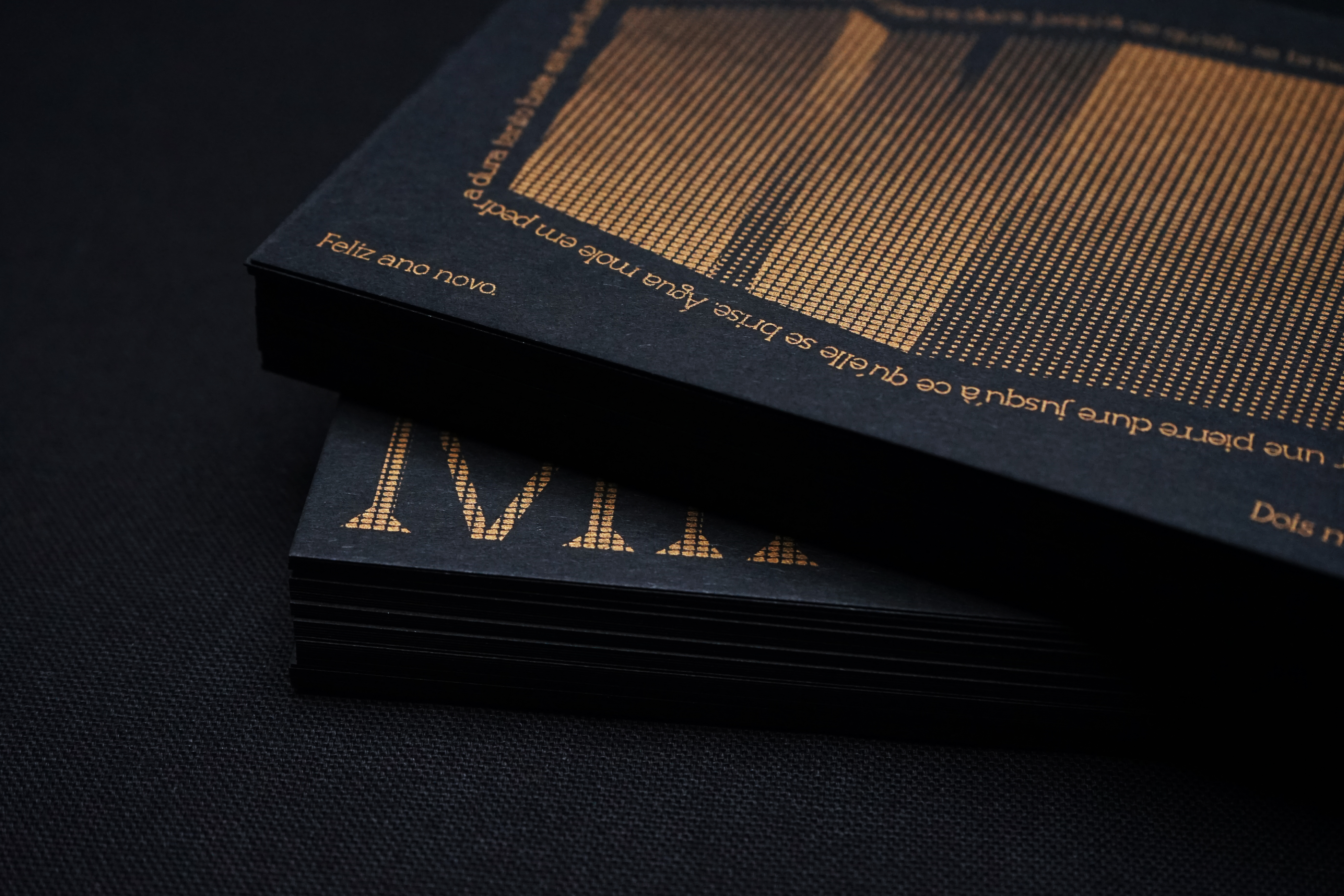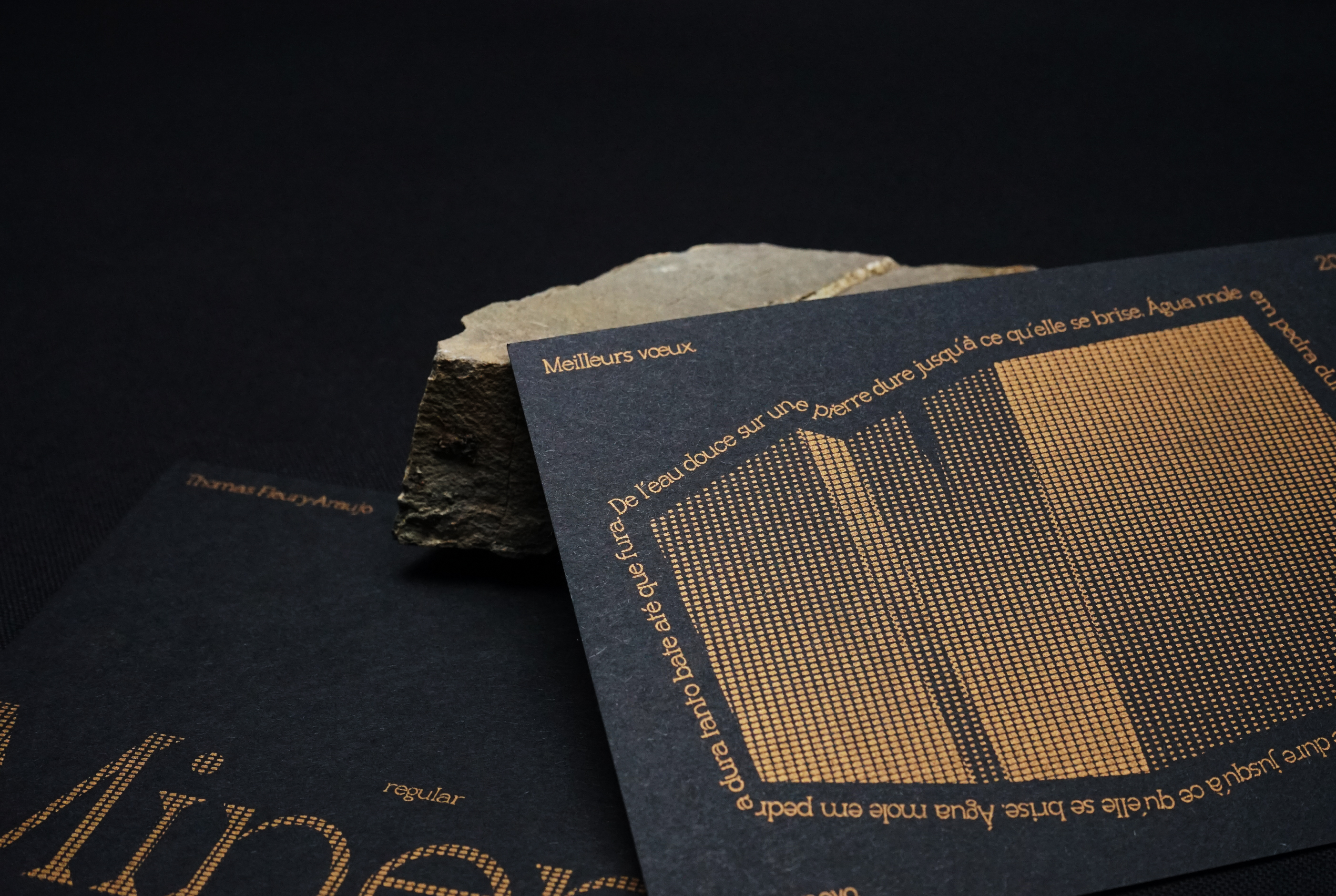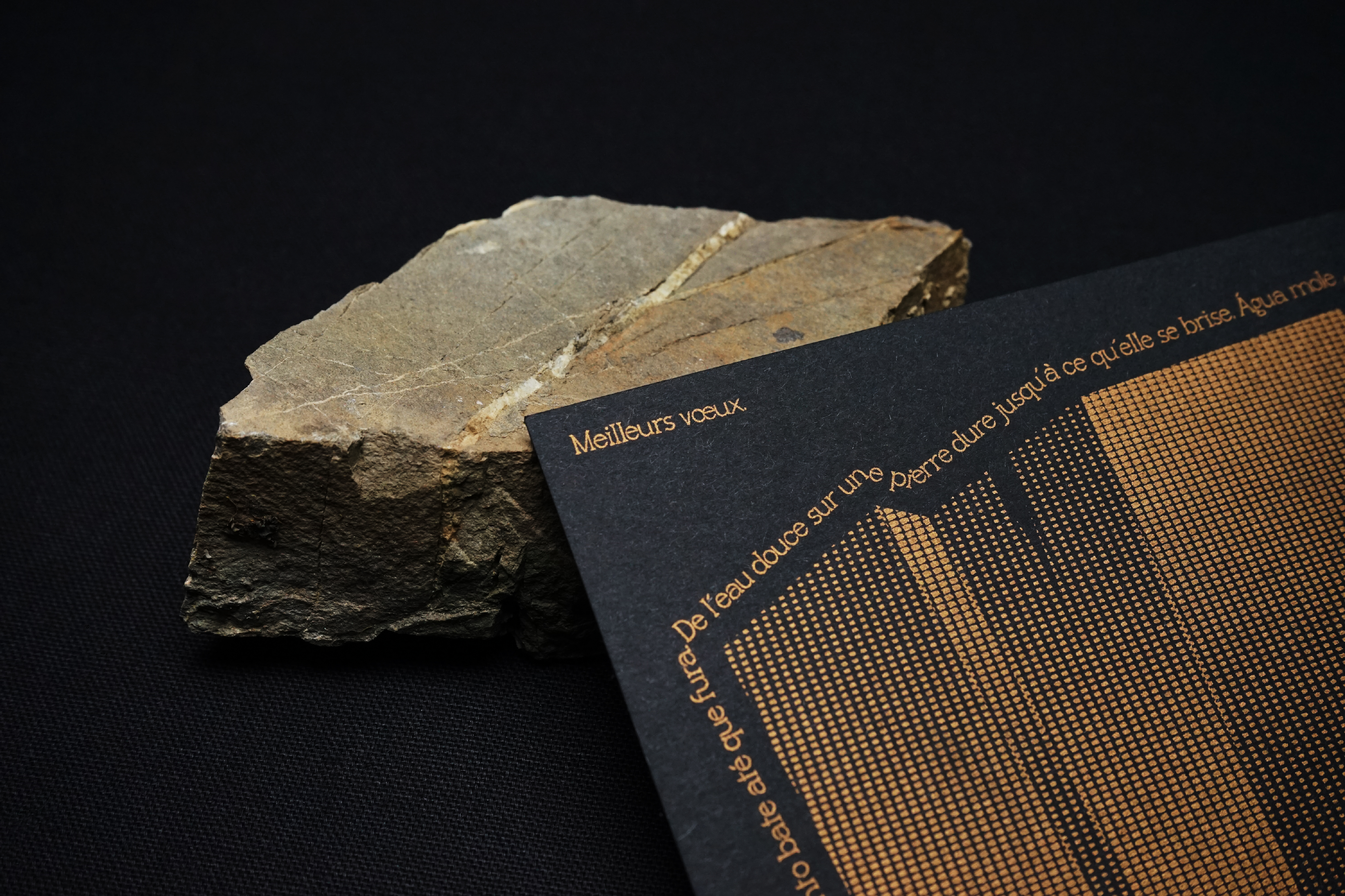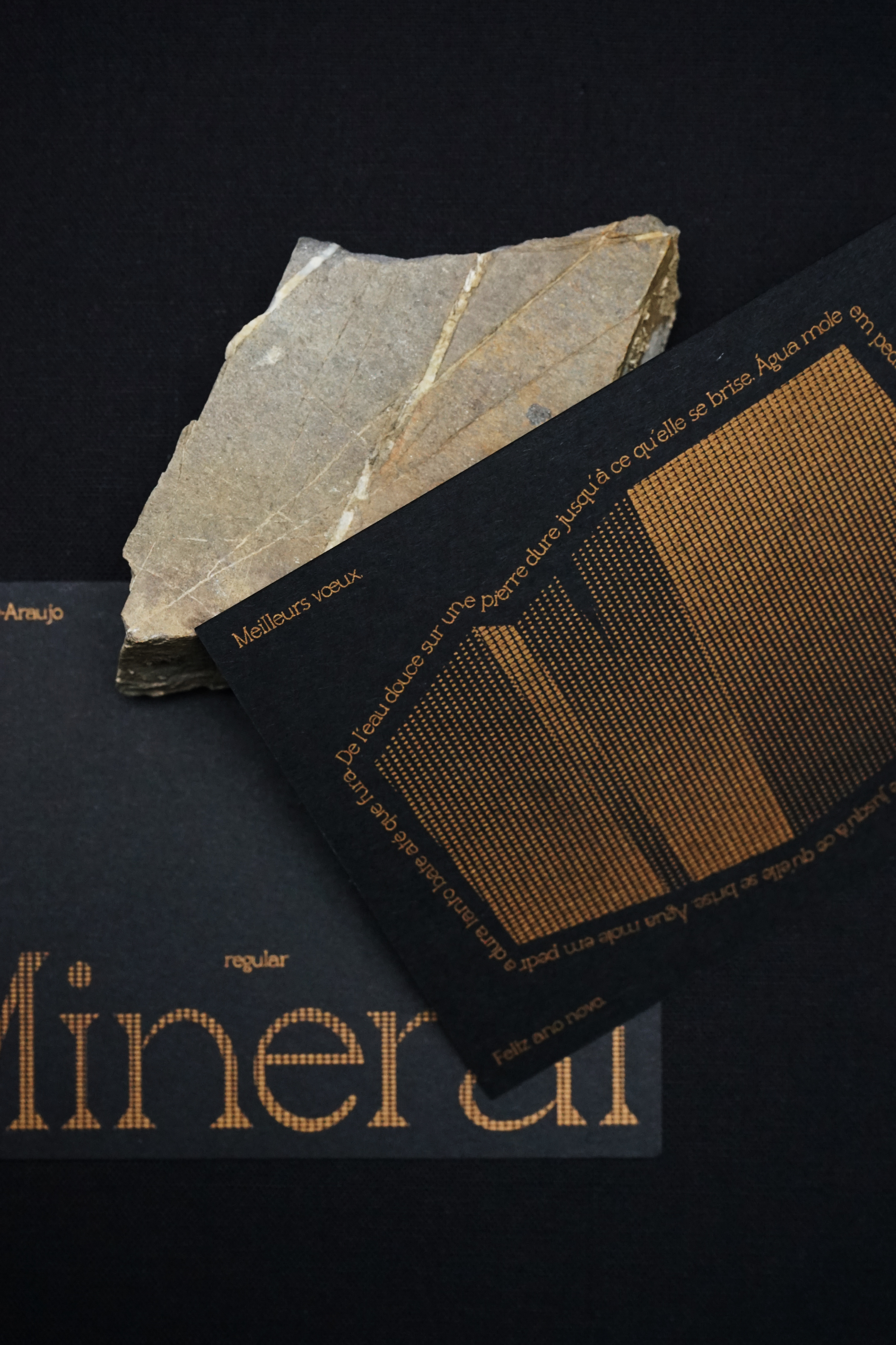 Cette carte de vœux, composée en Minerai, s'inspire de l'adage portugais “de l'eau douce sur une pierre dure jusqu'à ce qu'elle se brise", "Água mole em pedra dura tanto bate até que fura". Elle symbolise la persévérence : face à une tâche ou une action, la constance finit toujours par porter ses fruits.