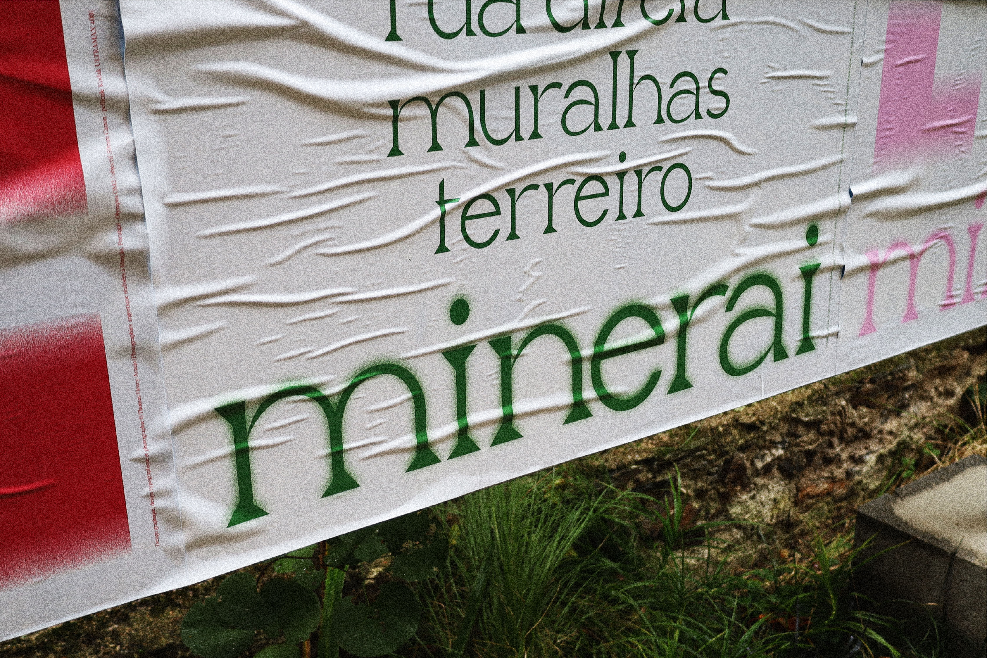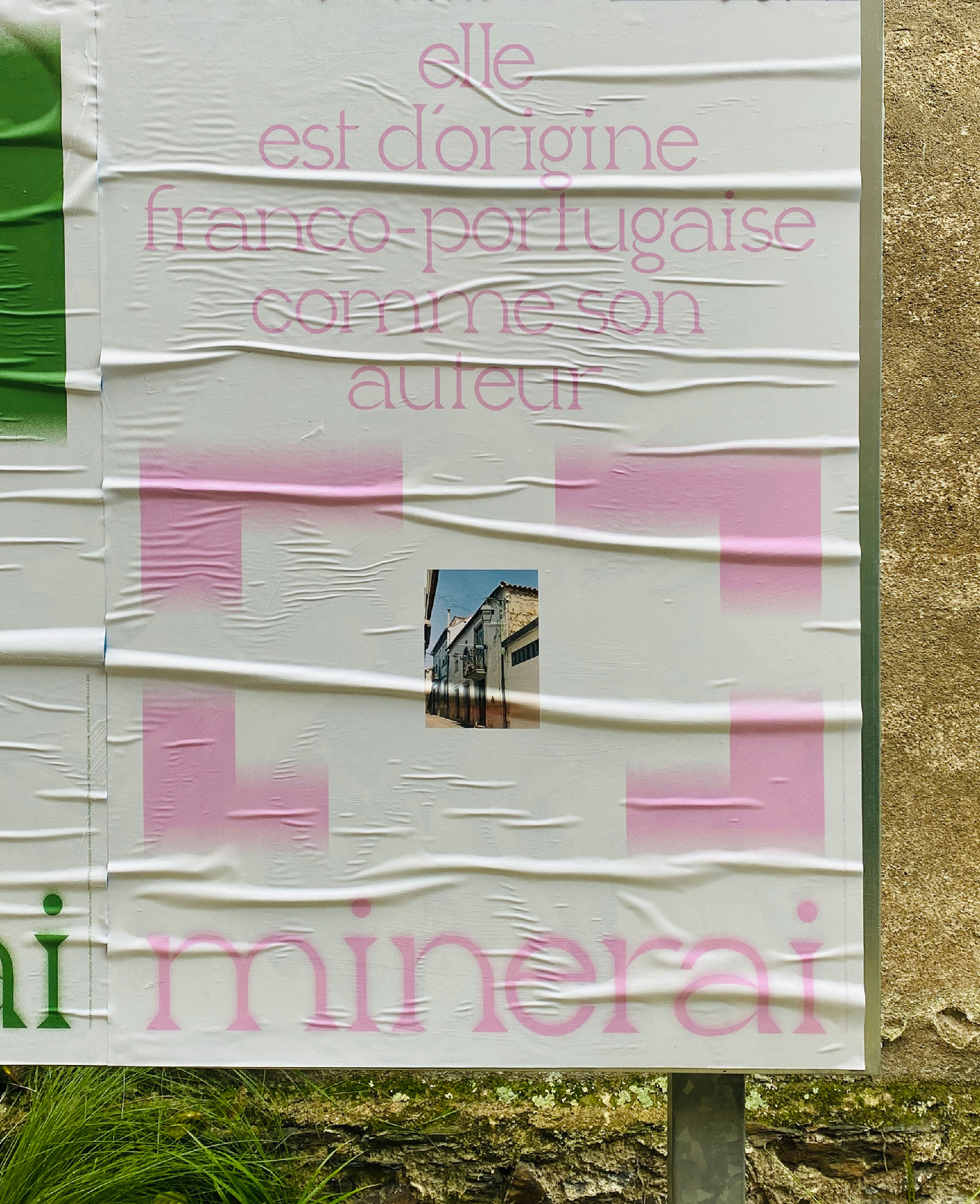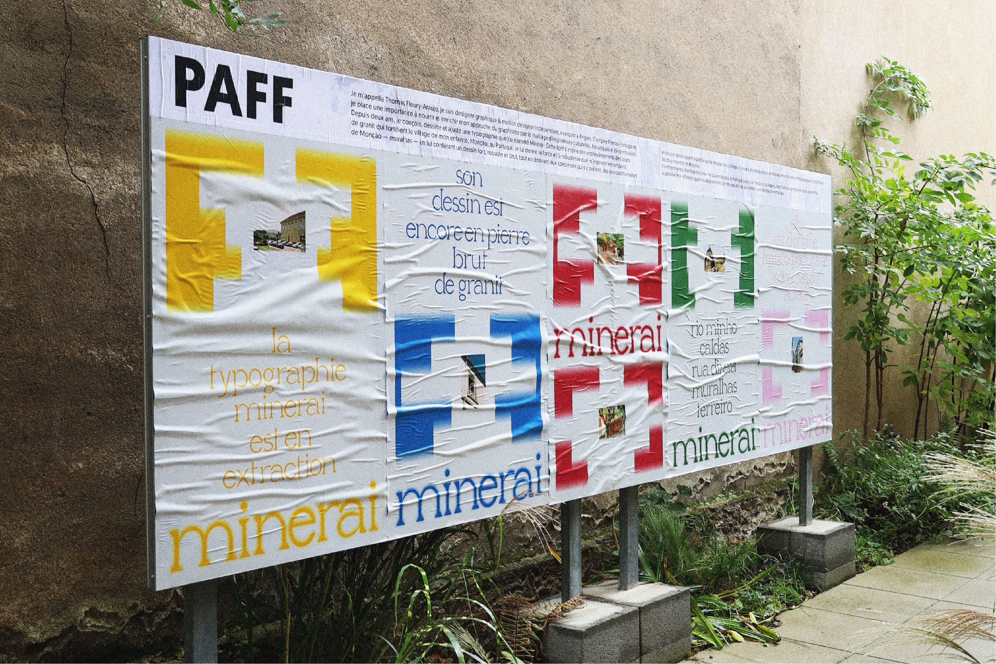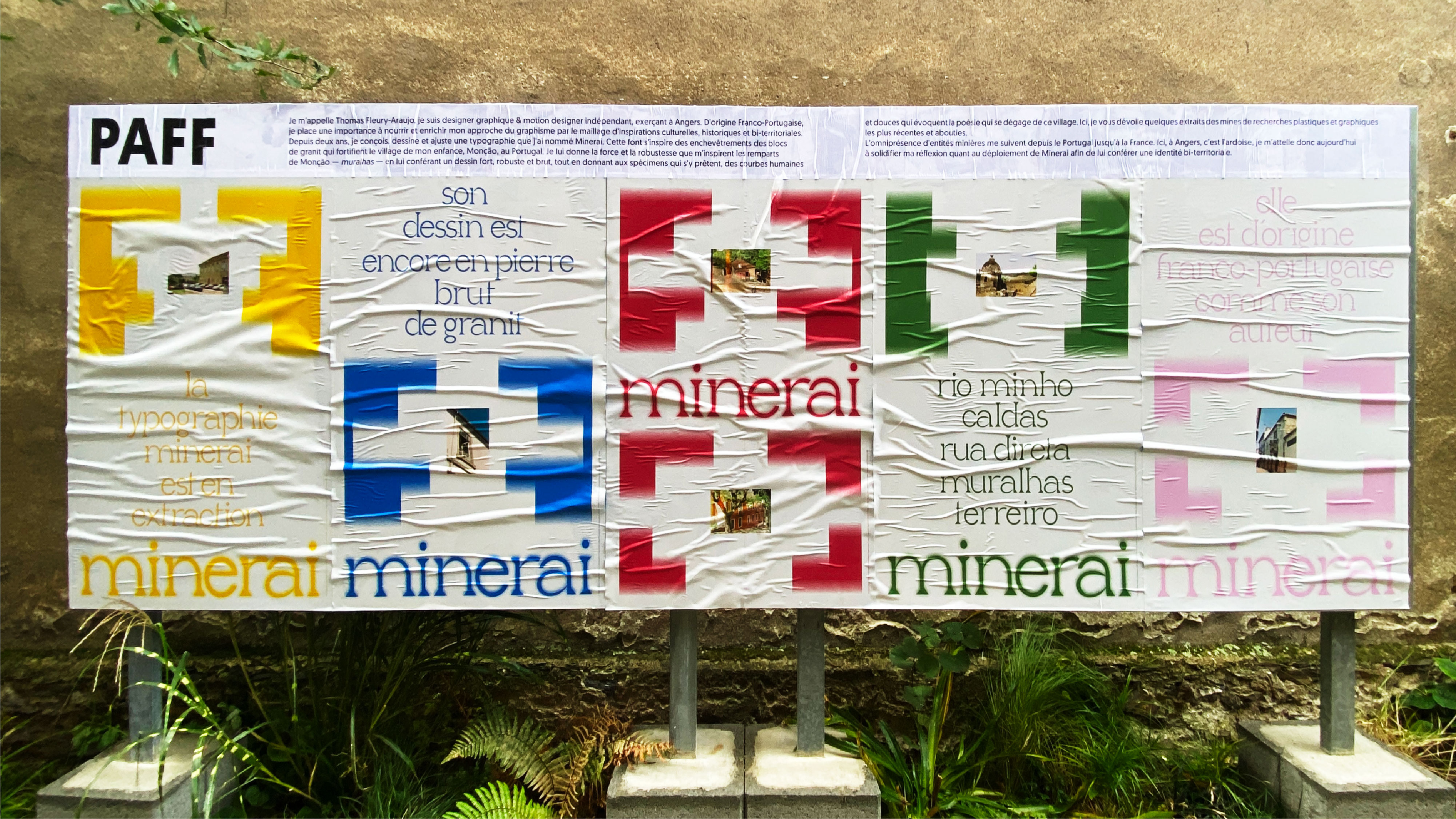 Pour inaugurer la nouvelle zone d’affichage libre à l’atelier-Angers, nommée PAFF, j’ai mis à l’honneur la typographie Minerai. Cette fonte s’inspire des enchevêtrements des blocs de granits qui fortifient le village de mon enfance, Monção, au Portugal. Je lui donne la force et la robustesse que m’inspire les remparts de Monção — muralhas — en lui conférant un dessin fort, robuste et brut, tout en donnant aux spécimens qui s’y prêtent, des courbes humaines et douces qui évoquent la poésie qui se dégage de ce village.