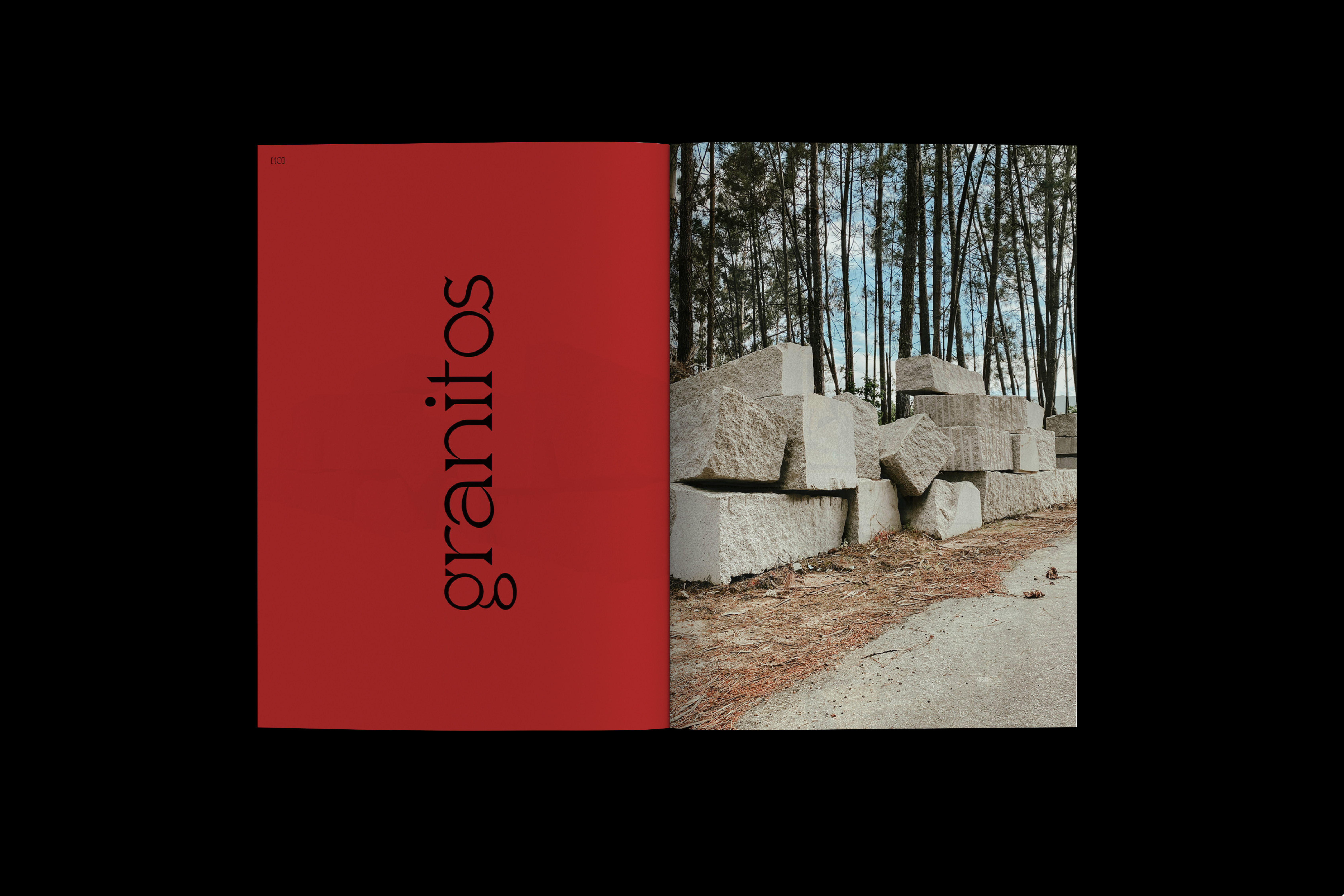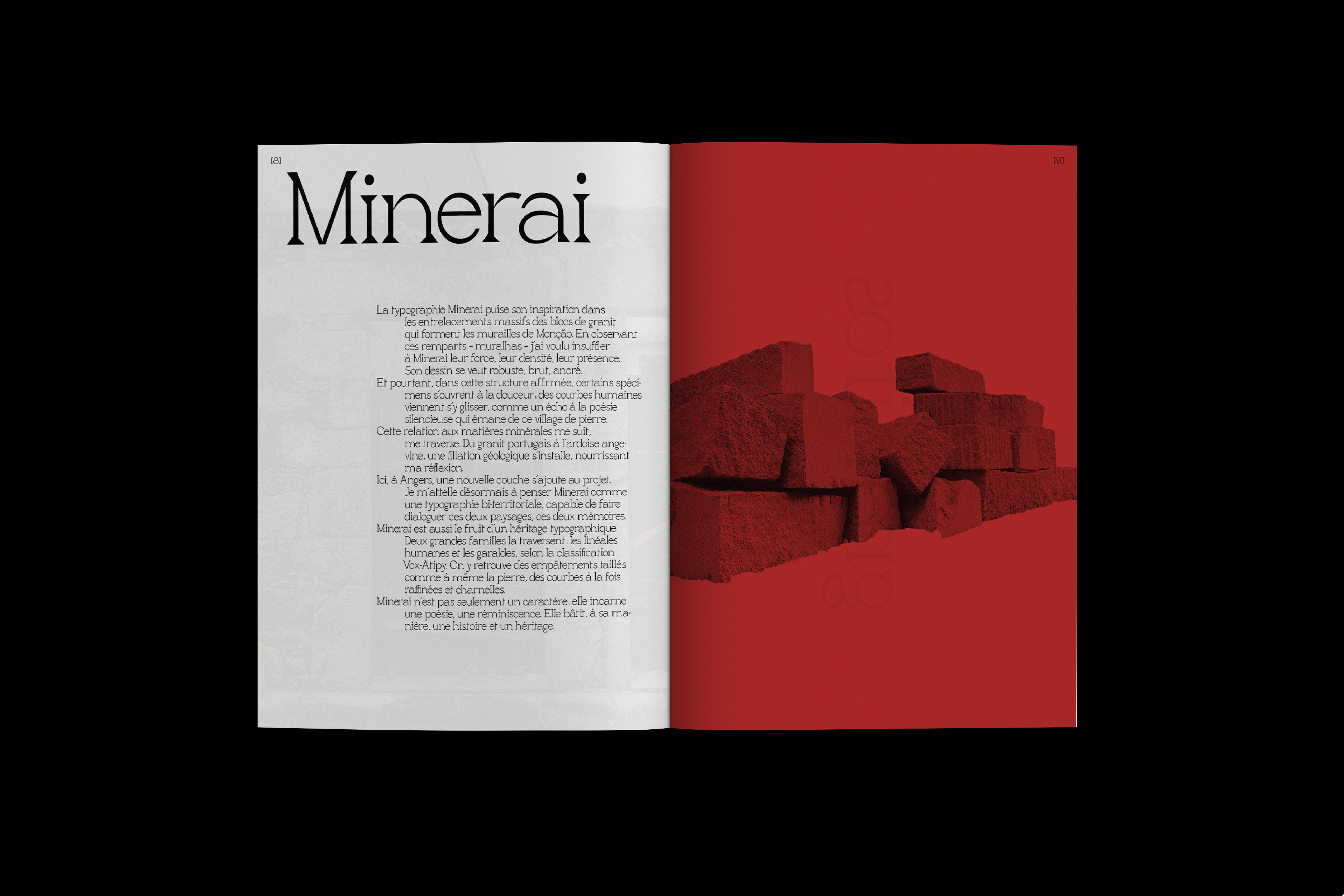 Accompagnant ces images, la typographie Minerai, que j’ai dessinée en écho aux lignes rugueuses et organiques de ces paysages, vient inscrire dans la matière du livre une forme de tension : entre structure et effritement, entre géométrie et irrégularité. Minerai est une typographie façonnée comme on taille une pierre ou comme on en extrait la mémoire.